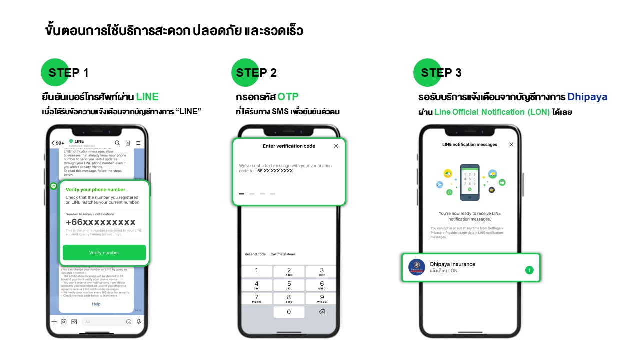 คุณสุภาพ ประดับการ กล่าวว่า “บริการ LINE Official Notification (LON)ถือเป็นอีกหนึ่งก้าวสำคัญของทิพยประกันภัยในการพัฒนา Ecosystem การให้บริการลูกค้าอย่างไร้รอยต่อ (Seamless) รองรับไลฟ์สไตล์ยุคดิจิทัลอย่างแท้จริง โดย LON จะเข้ามาแทนการแจ้งเตือนผ่าน SMS ที่เสี่ยงต่อการถูกปลอมแปลง ลูกค้าจึงมั่นใจได้ว่าทุกข้อความที่ได้รับมาจากทิพยประกันภัยโดยตรง 100% อีกทั้งยังสามารถดาวน์โหลดกรมธรรม์ ติดตามสถานะการให้บริการต่ออายุประกันภัย และใช้บริการต่าง ๆ ได้ครบจบในที่เดียวผ่าน LINE Official Account ของเรา”