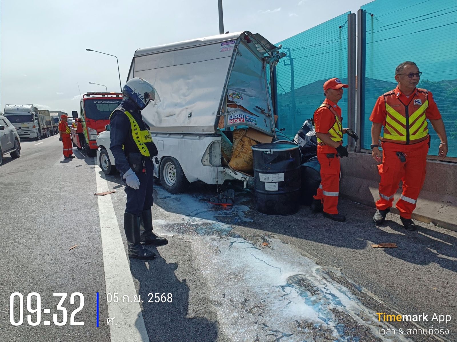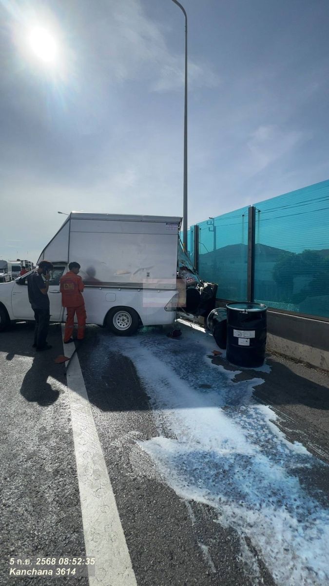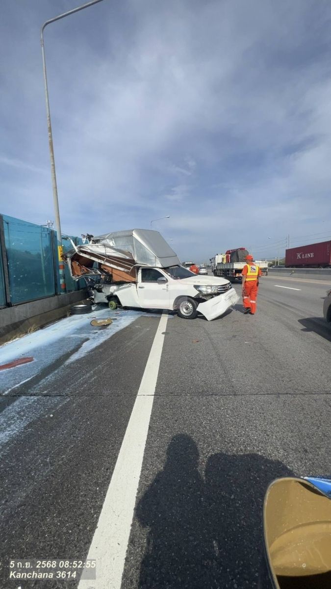 เวลา 08:35 น. (5 ก.ย.68) ทางพิเศษกาญจนาภิเษก (บางพลี-สุขสวัสดิ์) มุ่งหน้าถนนพระราม 2 ช่วงกม.9+800 A รถกระบะ ตู้ทึบยางแตก ล้อหลุด ชนขอบทาง กาวลาเท็กซ์ ที่บรรทุกมาหกเปื้อนผิวจราจร และกาวบางส่วนตกลงไปบนผิวจราจรด้านล่างด้วย จนท.อยู่ระหว่างประสานรถน้ำเข้ามาทำความสะอาด รถติด ท้ายแถวสะสมด่านบางครุ