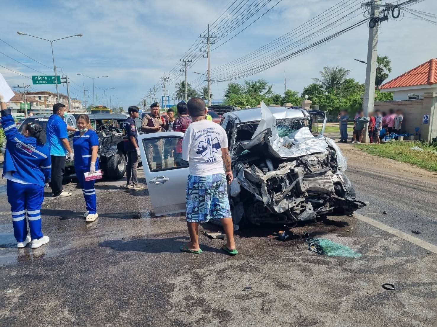 รถกระบะเสียหลักชนกัน แล้วรถเก๋งตามหลังชนซ้ำ กลางถนนสายสมุทรสงคราม – บางแพ มีผู้เสียชีวิต 1 ราย จ.ราชบุรี