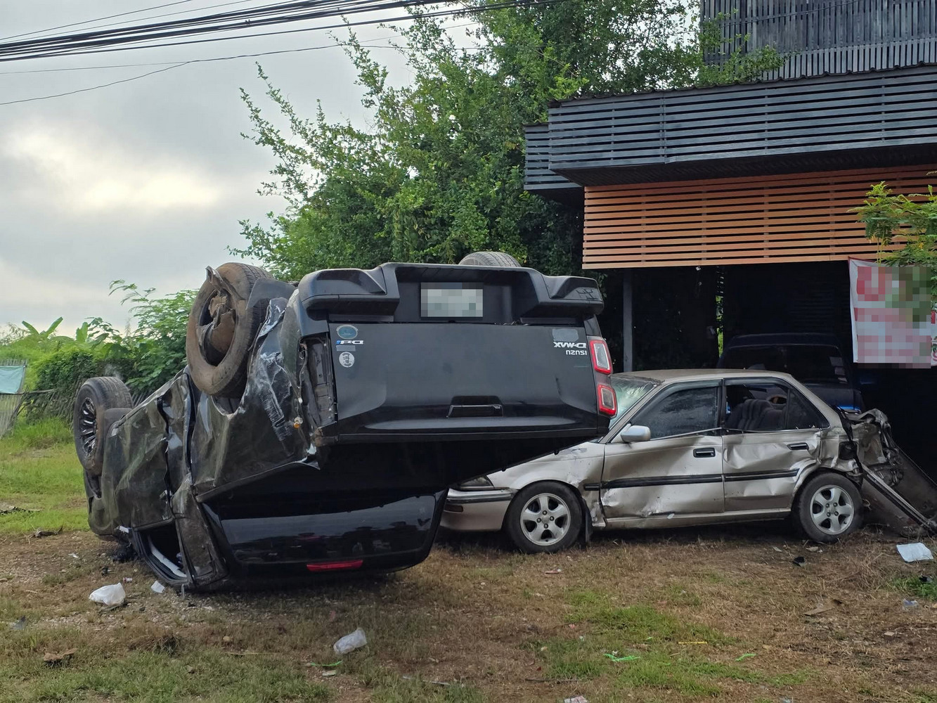 ที่เกิดเหตุ พบรถยนต์กระบะ อีซูซุ ดีแม็กซ์ สีดำ ป้ายทะเบียน ลำปาง ลักษณะพลิกหงายท้องล้อชี้ฟ้า สภาพรถพังยับเสียหายทั้งคัน ข้างๆกั น พบรถยนต์เก๋งรุ่นเก่า สีทอง ทะเบียนลำปาง แถบซ้ายทั้งแถบพังเสียหาย และท้ายรถเก๋งยังกระเด็นไปชนติดกับรถกระบะแวนรุ่นเก่า สีน้ำเงิน ที่จอดอยู่ในบ้าน เสียหายอีก 1 คัน