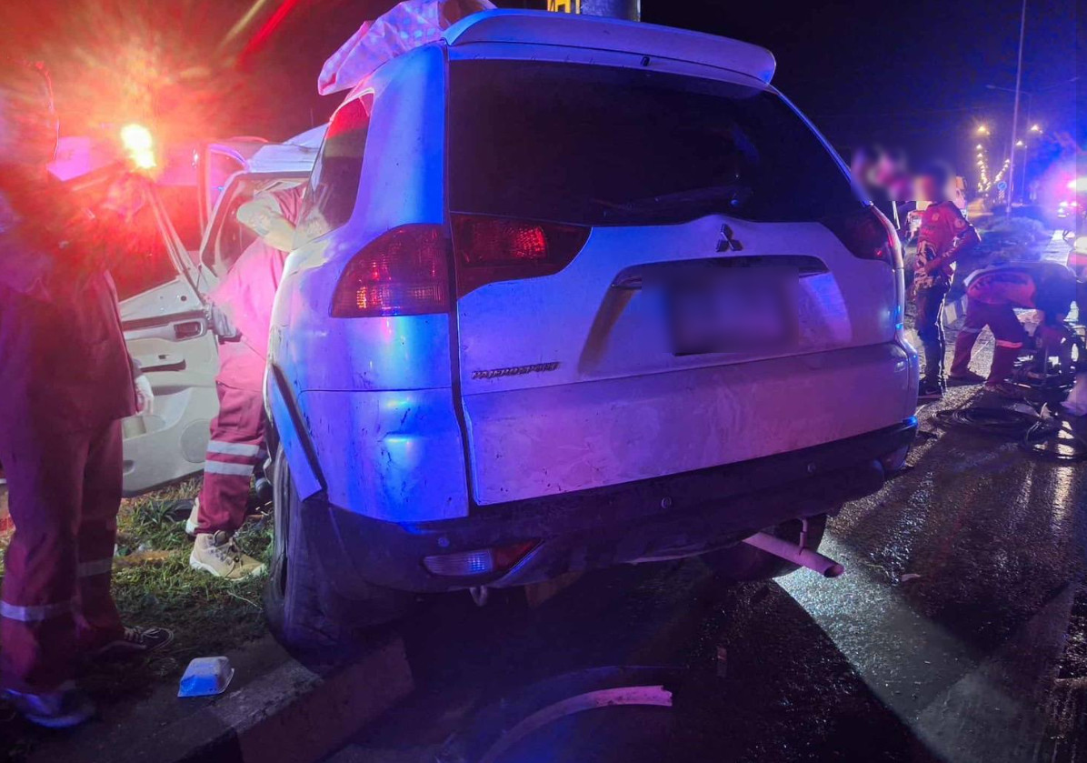 ที่เกิดเหตุพบรถยนต์มิตซูบิชิ ปาเจโร่ สีขาว ชนกับเสาไฟฟ้าเกาะกลางถนน ภายในรถมีผู้บาดเจ็บติดอยู่ภายใน เจ้าหน้าที่ใช้เครื่องตัดถ่างช่วยนำร่างออกมา ใช้เวลานานกว่า 30 นาที