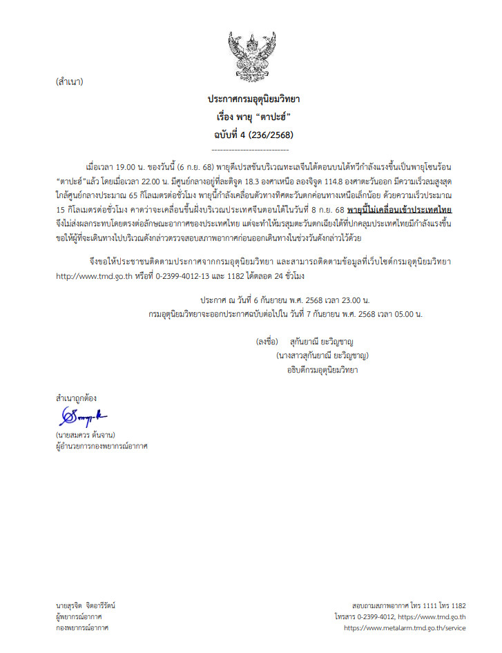 เมื่อเวลา 19.00 น. วันที่ 6 ก.ย. 68 พายุดีเปรสชันบริเวณทะเลจีนใต้ตอนบนได้ทวีกำลังแรงขึ้นเป็นพายุโซนร้อน “ตาปะฮ์”แล้ว โดยเมื่อเวลา 22.00 น. มีศูนย์กลางอยู่ที่ละติจูด 18.3 องศาเหนือ ลองจิจูด 114.8 องศาตะวันออก มีความเร็วลมสูงสุดใกล้ศูนย์กลางประมาณ 65 กิโลเมตรต่อชั่วโมง พายุนี้กำลังเคลื่อนตัวทางทิศตะวันตกค่อนทางเหนือเล็กน้อย ด้วยความเร็วประมาณ 15 กิโลเมตรต่อชั่วโมง คาดว่าจะเคลื่อนขึ้นฝั่งบริเวณประเทศจีนตอนใต้ในวันที่ 8 ก.ย. 68 พายุนี้ไม่เคลื่อนเข้าประเทศไทย จึงไม่ส่งผลกระทบโดยตรงต่อลักษณะอากาศของประเทศไทย แต่จะทำให้มรสุมตะวันตกเฉียงใต้ที่ปกคลุมประเทศไทยมีกำลังแรงขึ้น ขอให้ผู้ที่จะเดินทางไปบริเวณดังกล่าวตรวจสอบสภาพอากาศก่อนออกเดินทางในช่วงวันดังกล่าวไว้ด้วย