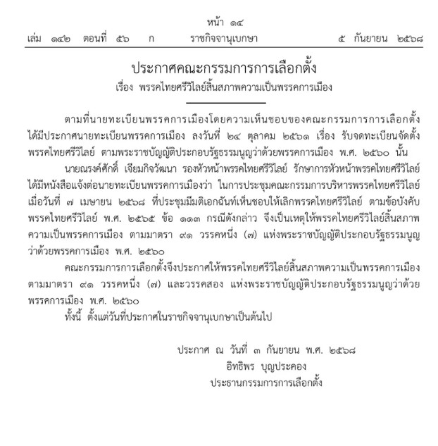 เมื่อวันที่ 5 กันยายน 2568 เว็บไซต์ราชกิจจานุเบกษา ได้เผยแพร่ประกาศคณะกรรมการการเลือกตั้ง (กกต.) เรื่อง พรรคไทยศรีวิไลย์ สิ้นสภาพความเป็นพรรคการเมือง
