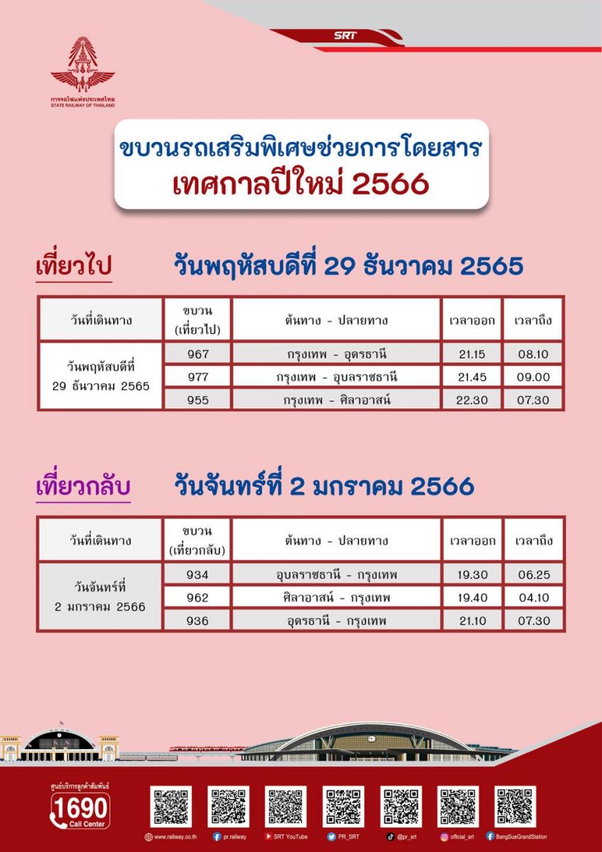 การรถไฟฯ จัดเพิ่มขบวนรถเสริมพิเศษ สายเหนือ-สายตะวันออกเฉียงเหนือ 6 ขบวน และพ่วงตู้โดยสารให้เต็มหน่วยลากจูงทุกขบวน พร้อมมอบของขวัญให้กับผู้ใช้บริการทุกคนในช่วงเทศกาลปีใหม่ 2566