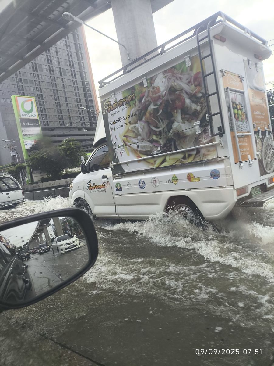 08.38 น. (9 ก.ย.68) ถนนศรีนครินทร์ ขาเข้า จาก MRT สถานีศรีด่าน - ท้ายซอยแบริ่ง น้ำท่วมขัง รถเล็กแนะนำอยู่ช่องทางซ้าย - กลาง รถชะลอตัว