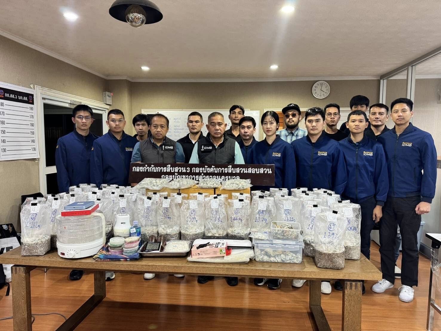พร้อมด้วยของกลาง รวม 65 รายการ ประกอบด้วยเห็ดขี้ควายอยู่ในระหว่างเพาะปลูก 47 รายการ น้ำหนักรวมประมาณ 56 กิโลกรัม, เห็ดขี้ควายอบแห้งน้ำหนักรวม 584 กรัม พร้อมด้วยอุปกรณ์การผลิตจำนวนมาก รวมมูลค่ากว่า 2.2 ล้านบาท