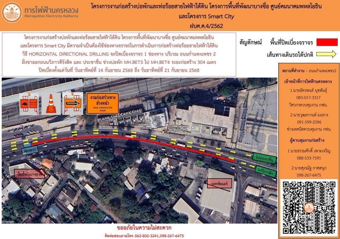 MEA แจ้งปิดเบี่ยงจราจร 1 ช่องทาง บริเวณถนนกำแพงเพชร 2 เพื่อก่อสร้างบ่อพักและท่อร้อยสายใต้ดิน วันที่ 14 ก.ย. (เวลา 22.00 น.) - 19 ก.ย. 68 และวันที่ 20 - 21 ก.ย. 68 เวลา 23.00-12.00 น. ผู้สัญจรบริเวณดังกล่าวโปรดหลีกเลี่ยงเส้นทาง