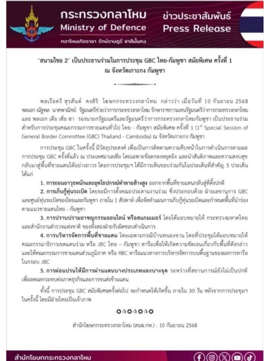 วันนี้ (10 ก.ย.2568) พล.ร.ต.สุรสันต์ คงสิริ โฆษกกระทรวงกลาโหม กล่าวว่า พล.อ.ณัฐพล นาคพาณิชย์ รมช.กลาโหม รักษาราชการแทน รมว.กลาโหม และ พล.อ.เตีย เซีย ฮา รองนายกรัฐมนตรีและ รมว.กลาโหมกัมพูชา เป็นประธานร่วม สำหรับการประชุมคณะกรรมการชายแดนทั่วไป ไทย - กัมพูชา สมัยพิเศษ ครั้งที่ 1 (1st Special Session of General Border Committee (GBC) Thailand - Cambodia) ณ จังหวัดเกาะกง กัมพูชา