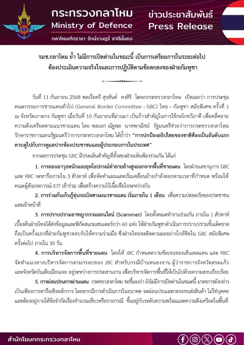วันที่ 11 กันยายน 2568 พลเรือตรี สุรสันต์ คงสิริ โฆษกกระทรวงกลาโหม เปิดเผยว่า การประชุมคณะกรรมการชายแดนทั่วไป (General Border Committee : GBC) ไทย - กัมพูชา สมัยพิเศษ ครั้งที่ 1 ณ จังหวัดเกาะกง กัมพูชา เมื่อวันที่ 10 กันยายนที่ผ่านมา เป็นก้าวสำคัญในการใช้กลไกทวิภาคี เพื่อคลี่คลายความตึงเครียดตามแนวชายแดน โดย พลเอก ณัฐพล นาคพาณิชย์ รัฐมนตรีช่วยว่าการกระทรวงกลาโหม รักษาราชการแทนรัฐมนตรีว่าการกระทรวงกลาโหม ได้ย้ำว่า “การปกป้องอธิปไตยของชาติต้องเป็นอันดับแรก ควบคู่ไปกับการดูแลปากท้องประชาชนและผู้ประกอบการในประเทศ”