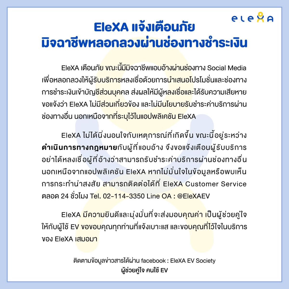 EleXA ไม่ได้นิ่งนอนใจกับเหตุการณ์ที่เกิดขึ้น ขณะนี้อยู่ระหว่างดำเนินการทางกฎหมายกับผู้ที่แอบอ้าง จึงขอแจ้งเตือนผู้รับบริการ อย่าได้หลงเชื่อผู้ที่อ้างว่าสามารถรับชำระค่าบริการผ่านช่องทางอื่นนอกเหนือจากแอปพลิเคชัน EleXA หากไม่มั่นใจในข้อมูลหรือพบเห็นการกระทำน่าสงสัย สามารถติดต่อได้ที่ EleXA Customer Service ตลอด 24 ชั่วโมง Line OA: @EleXAEV และ Tel. 02-114-3350