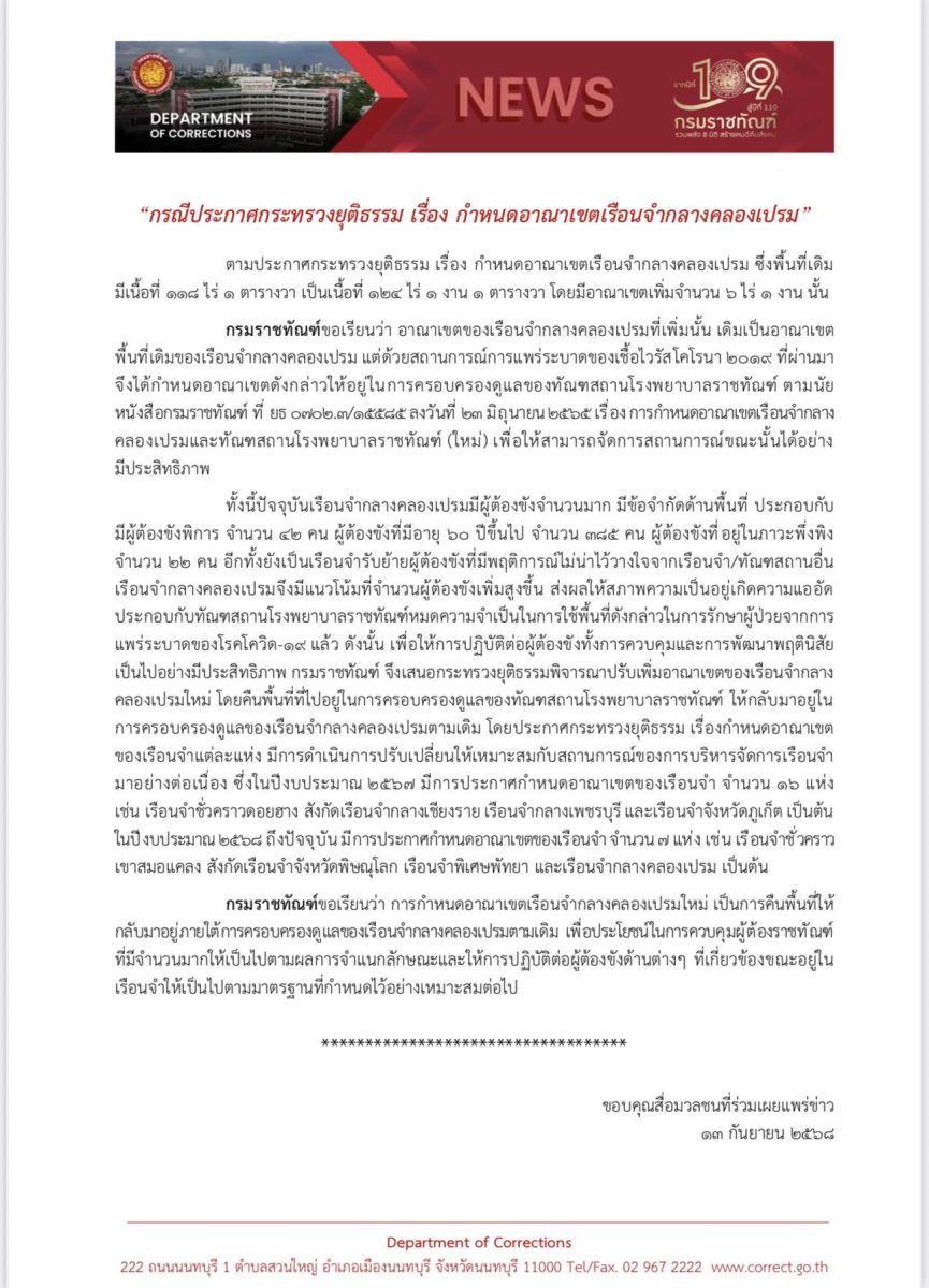 13 กันยายน 2568 กรมราชทัณฑ์ เผยแพร่เอกสารชี้แจง กรณีประกาศกระทรวงยุติธรรม เรื่อง กำหนดอาณาเขตเรือนจำกลางคลองเปรม ระบุข้อความว่า "ตามประกาศกระทรวงยุติธรรม เรื่อง กำหนดอาณาเขตเรือนจำกลางคลองเปรม ซึ่งพื้นที่เดิม