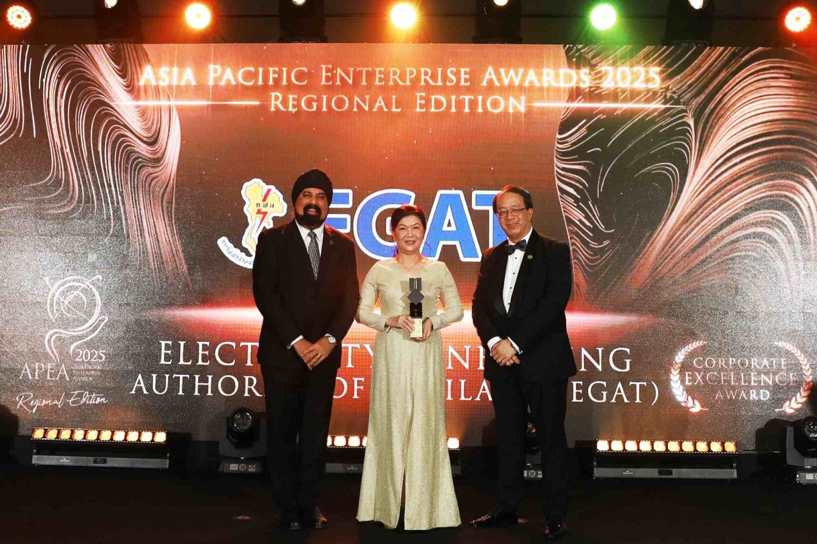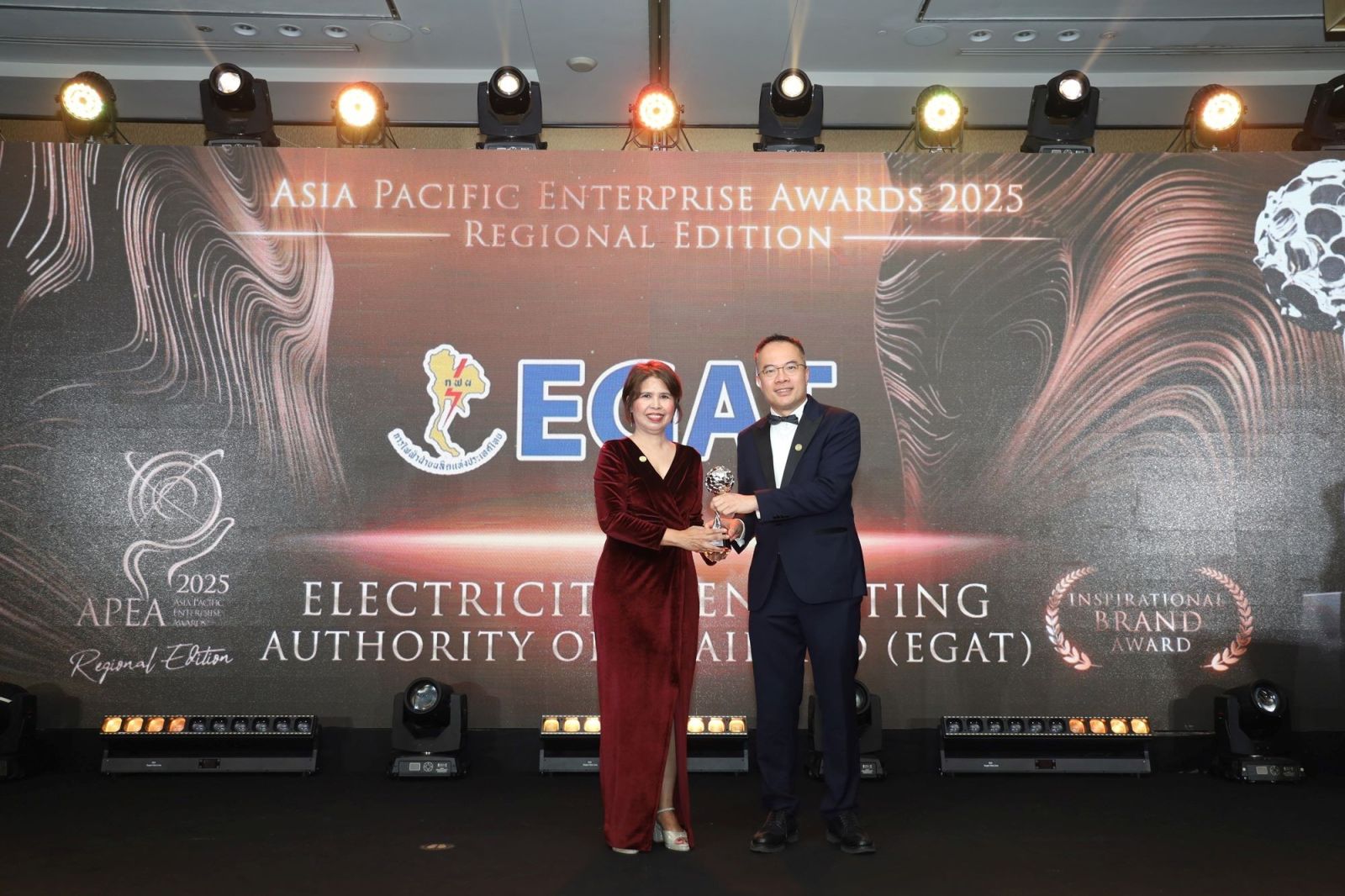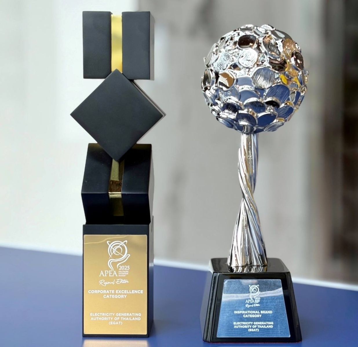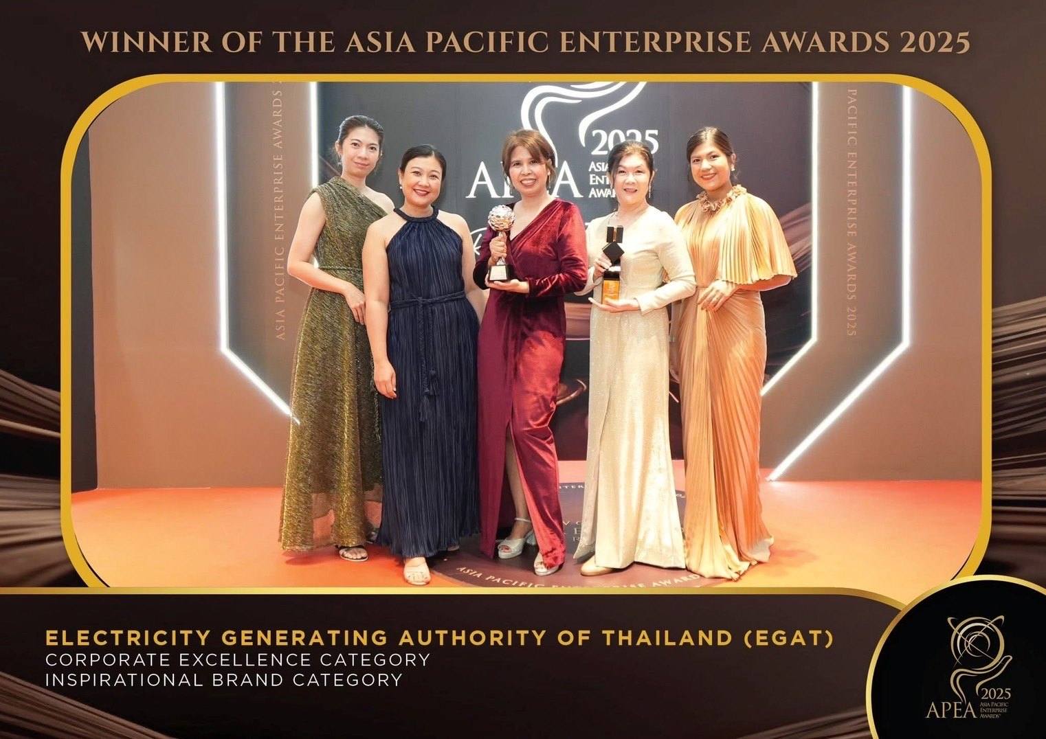 นางสาวรัชดาพร เสียงเสนาะ ผู้อำนวยการฝ่ายสื่อสารและประชาสัมพันธ์องค์การ และ นางสาวตติยา สาครพันธ์ ผู้ช่วยผู้อำนวยการฝ่ายสื่อสารและประชาสัมพันธ์องค์การ เป็นผู้แทนการไฟฟ้าฝ่ายผลิตแห่งประเทศไทย (กฟผ.) เข้ารับรางวัล Corporate Excellence Award และรางวัล Inspirational Brand Award จากเวที Asia Pacific Enterprise Awards (APEA 2025) Regional Edition ซึ่งจัดโดย Enterprise Asia องค์กรพัฒนาเอกชนชั้นนำของเอเชีย ที่มุ่งส่งเสริมการประกอบการที่มีความยั่งยืนและมีความรับผิดชอบต่อสังคม ณ Sands Expo & Convention Centre สาธารณรัฐสิงคโปร์ เมื่อวันที่ 5 กันยายน 2568 ที่ผ่านมา