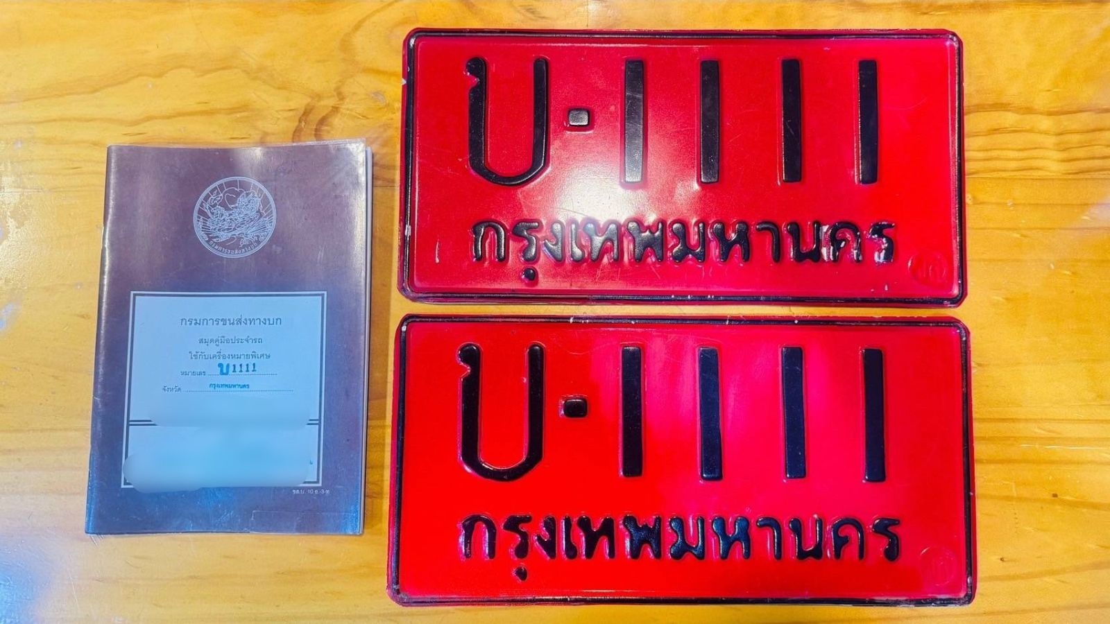 - ป้ายหมายเลขทะเบียนปลอม (ป้ายแดง) จำนวน 2 แผ่น