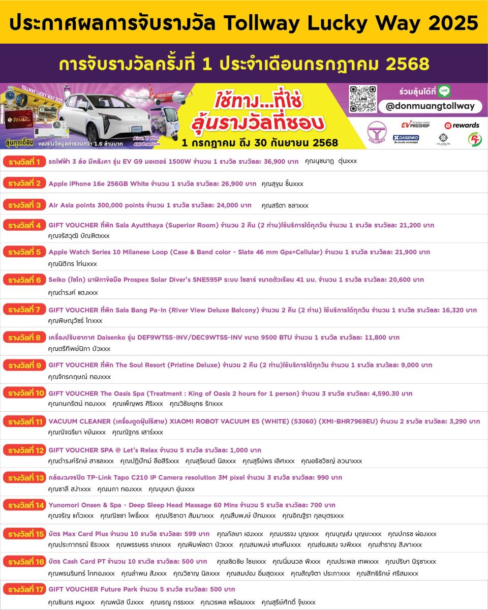 ประกาศรายชื่อผู้โชคดีจากการจับรางวัล ครั้งที่ 1 ประจำเดือนกรกฎาคม 2568 Tollway Lucky Way 2025 ใช้ทางที่ใช่...ลุ้นรางวัลที่ชอบ (1 กรกฎาคม - 30 กันยายน 2568)