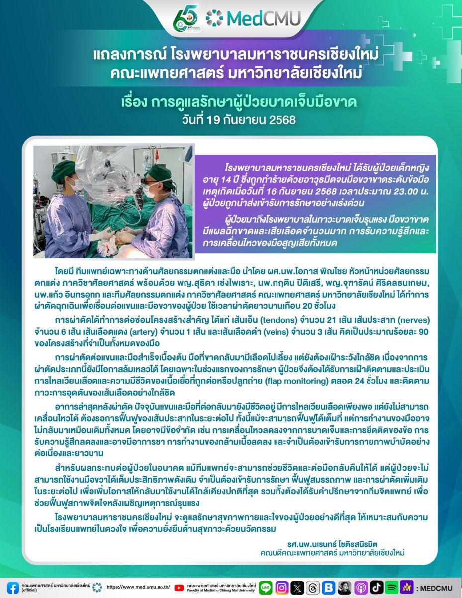 โรงพยาบาลมหาราชนครเชียงใหม่ คณะแพทยศาสตร์ มหาวิทยาลัยเชียงใหม่ ออกแถลงการณ์ เรื่อง การดูแลรักษาผู้ป่วยบาดเจ็บมือขาด ว่า