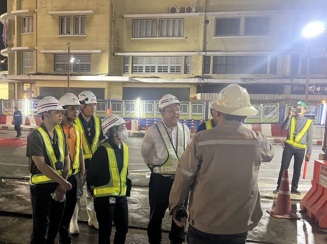 การรถไฟฟ้าขนส่งมวลชนแห่งประเทศไทย (รฟม.) โดยสำนักงานความปลอดภัย อาชีวอนามัยและสภาพแวดล้อมในการทำงาน (สปอ.) ลงพื้นที่ตรวจสอบการดำเนินงานด้านความปลอดภัยในการก่อสร้าง โครงการรถไฟฟ้าสายสีส้ม ช่วงบางขุนนนท์ – มีนบุรี (สุวินทวงศ์) ช่วงเวลากลางคืน (Night Audit) โดยลงพื้นที่บริเวณสถานีอนุสาวรีย์ประชาธิปไตย สถานีหลานหลวง สถานียมราช สถานีราชเทวี สถานีประตูน้ำ และสถานีราชปรารภ โดยได้ตรวจสอบการติดตั้งแผงผ้าใบ ไฟส่องสว่าง ไฟสัญญาณเตือน และป้ายเตือนต่างๆ ตามแนวเขตก่อสร้าง ให้มั่นคงแข็งแรง อยู่ในตำแหน่งที่ปลอดภัย สามารถเห็นได้อย่างชัดเจน การเก็บวัสดุอุปกรณ์ที่ไม่ใช้แล้วให้เรียบร้อย การจัดวางแนวแบริเออร์ (Barriers) โดยแนวแบริเออร์จะต้องอยู่ภายในเขตพื้นที่ที่กำหนดเพื่อไม่ให้ล้ำเข้าพื้นผิวจราจร ซึ่งเป็นการป้องกันอุบัติเหตุที่อาจเกิดขึ้นจากการใช้ถนนในบริเวณดังกล่าว พร้อมกำชับให้เจ้าหน้าที่ทุกคนสวมใส่อุปกรณ์คุ้มครองความปลอดภัยส่วนบุคคลให้ครบถ้วนตลอดระยะเวลาที่ปฏิบัติงาน และปฏิบัติตามมาตรฐานความปลอดภัยที่กำหนดอย่างเคร่งครัด