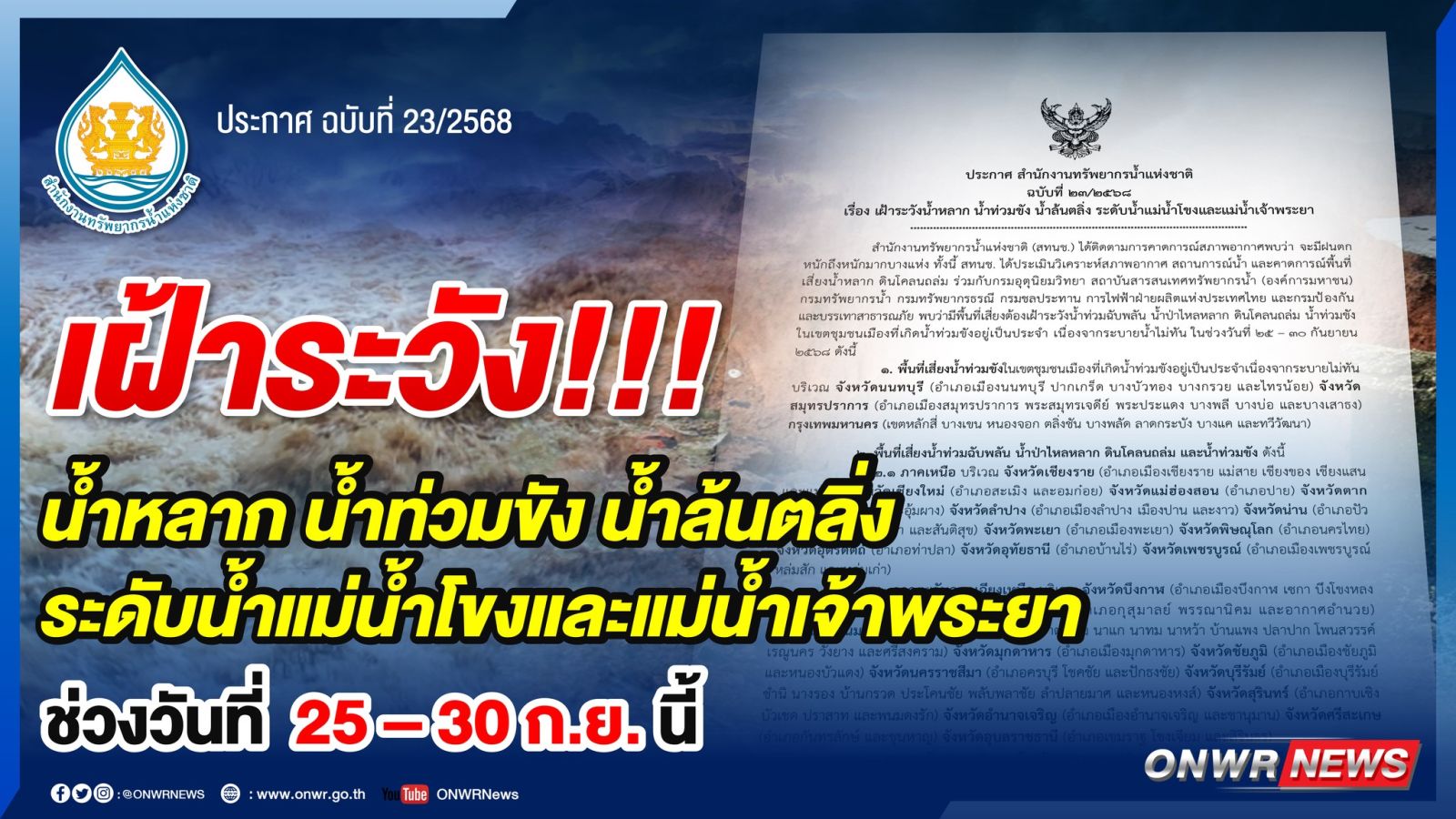 สำนักงานทรัพยากรน้ำแห่งชาติ ประกาศฉบับที่ 23/2568 เรื่อง เฝ้าระวังน้ำหลาก น้ำท่วมขัง น้ำล้นตลิ่ง ระดับน้ำแม่น้ำโขงและแม่น้ำเจ้าพระยา