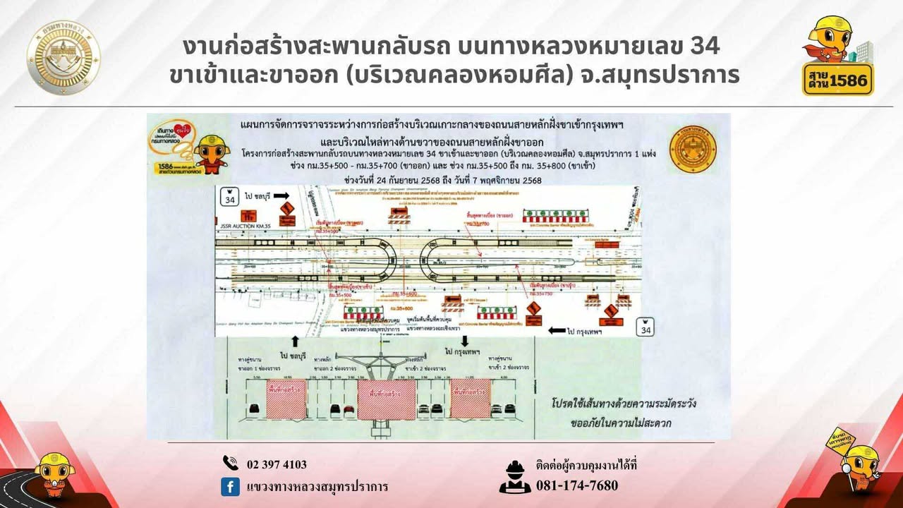แจ้งเบี่ยงการจราจรชั่วคราว เพื่อก่อสร้างคานยื่นหัวเสา (Cantilever Deck) แขวงทางหลวงสมุทรปราการ ขอแจ้งให้ผู้ใช้ทางทราบว่า จะมีการปิดเบี่ยงการจราจรเพื่อก่อสร้างคานยื่นหัวเสา (Cantilever Deck) บนทางหลวงหมายเลข 34 (ถนนเทพรัตน) ขาเข้าและขาออก ซึ่งในระหว่างการก่อสร้าง อาจจะมีการปิดจราจรเป็นบางช่วงชั่วคราว