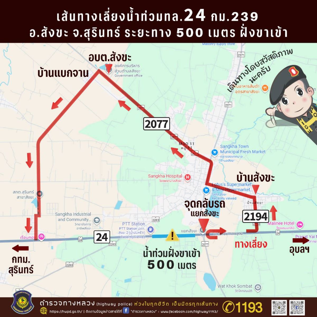 ด้าน งานจราจร สถานีตำรวจภูธรสังขะ จังหวัดสุรินทร์ ก็รายงานเช่นกันว่า ทล.24 (โชคชัย-เดชอุดม) น้ำท่วมผิวทางจราจร ช่วง กม.ที่ 239 โดยแนะนำให้ใช้ทางเบี่ยงก่อนถึงหน้าวิทยาลัยการอาชีพสังขะ โดยเลี้ยวซ้ายหน้าโรงเรียนไทยสมบูรณ์ ส่วนรถบรรทุกสามารถผ่านได้ ส่วนรถยนต์เล็ก ควรหลีกเลี่ยงเส้นทาง ด้วยความปรารถนาดีจากสถานีตำรวจภูธรสังขะ