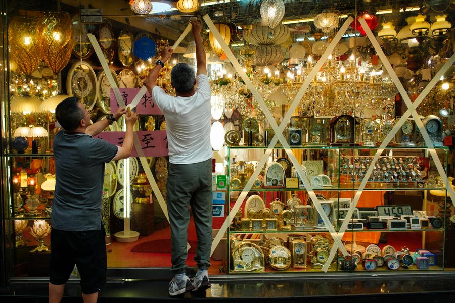 (แฟ้มภาพซินหัว : โรงแรมแห่งหนึ่งในเขตบริหารพิเศษฮ่องกงทางตอนใต้ของจีนวางเรียงกระสอบทรายป้องกันน้ำท่วม วันที่ 22 ก.ย. 2025)