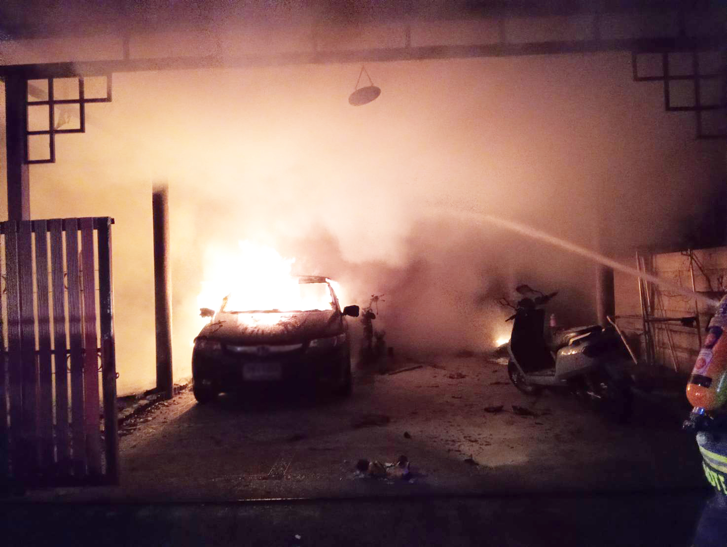 ไฟไหม้ที่โรงจอดรถแล้วลุกลามบ้านเรือน ย่านถนนบางบอน 5 จนท.พร้อมรถดับเพลิงระดมฉีดน้ำควบคุมเพลิง