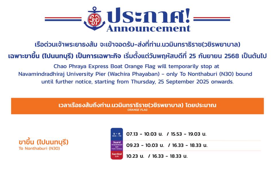 ประกาศ เรือด่วนเจ้าพระยาธงส้ม จะเข้าจอดรับ-ส่งที่ท่าม.นวมินทราธิราช (วชิรพยาบาล) **เฉพาะขาขึ้น (จากวัดราชสิงขรไปนนทบุรี)** เป็นการเฉพาะกิจ เริ่มตั้งแต่วันพฤหัสบดีที่ 25 กันยายน 2568 เป็นต้นไป จนกว่าจะมีการเปลี่ยนแปลง