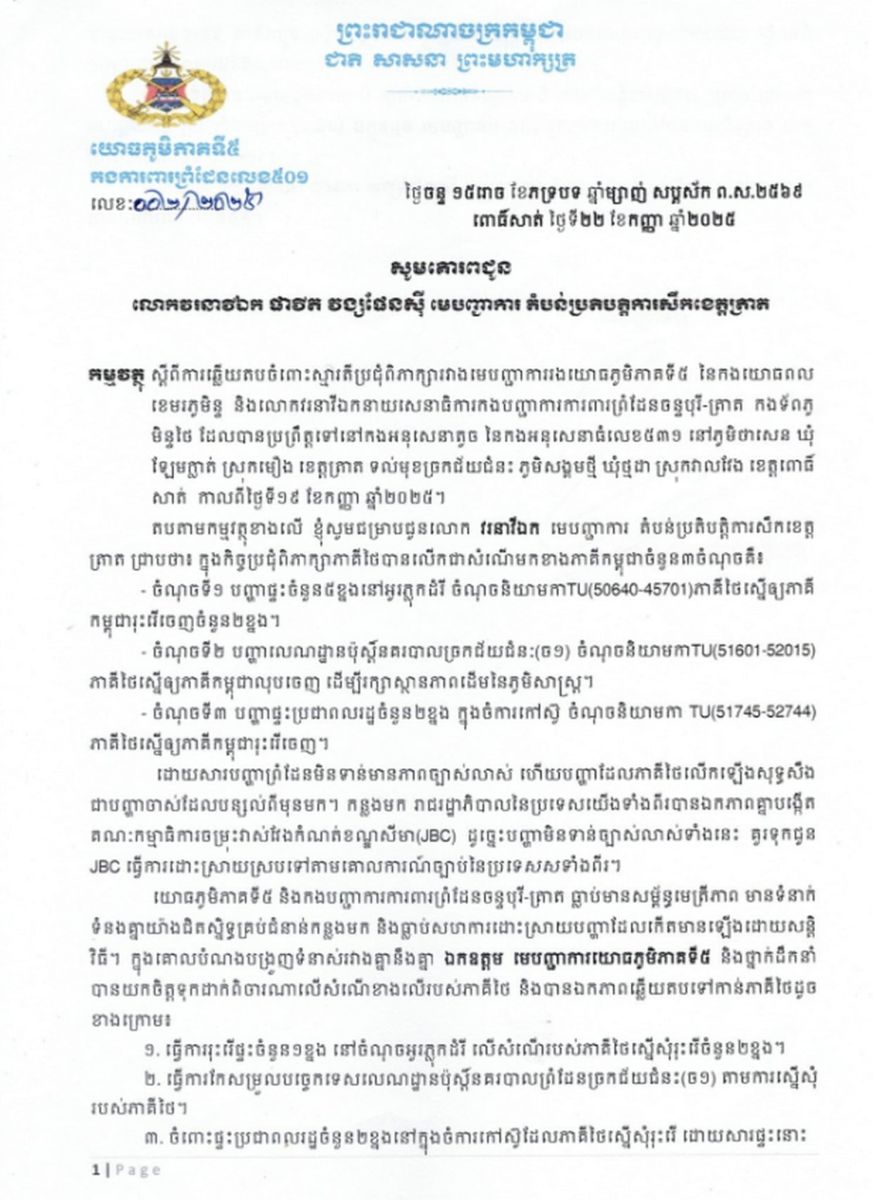 วันนี้ (25 ก.ย.68) กองป้องกันชายแดนที่ 501 ภูมิภาคทหารที่ 5 ส่งหนังสือตอบกลับข้อเสนอจากหน่วยเฉพาะกิจนาวิกโยธินตราด อย่างเป็นทางการ หลังการประชุมระดับพื้นที่เมื่อวันที่ 19 ก.ย.68 ที่ผ่านมา โดยยอมรื้อถอนบ้าน 1 หลัง และแก้ไขคูสนามตามข้อเรียกร้อง แต่ปฏิเสธที่จะรื้อบ้านประชาชนอีก 2 หลัง ในสวนยางพารา โดยระบุให้เป็นหน้าที่ของคณะกรรมาธิการเขตแดนร่วม (JBC) ในการพิจารณา โดยเอกสารดังกล่าว ลงวันที่ 22 ก.ย.68 และลงนามโดย พันเอก จัน บุนดี ผู้บังคับกองป้องกันชายแดนที่ 501 ภูมิภาคทหารที่ 5 กองทัพกัมพูชา ส่งถึง นาวาเอก ภริศวร์ วงษ์เพ็ญศรี ผู้บังคับการหน่วยเฉพาะกิจนาวิกโยธินตราด เพื่อตอบประเด็นจากการประชุมหารือระหว่างรองผู้บัญชาการภูมิภาคทหารที่ 5 กัมพูชา และเสนาธิการป้องกันชายแดนจันทบุรีและตราดของไทย ณ จุดตรวจร้อย.ทพ.นย.531 บ้านท่าเส้น จ.ตราด