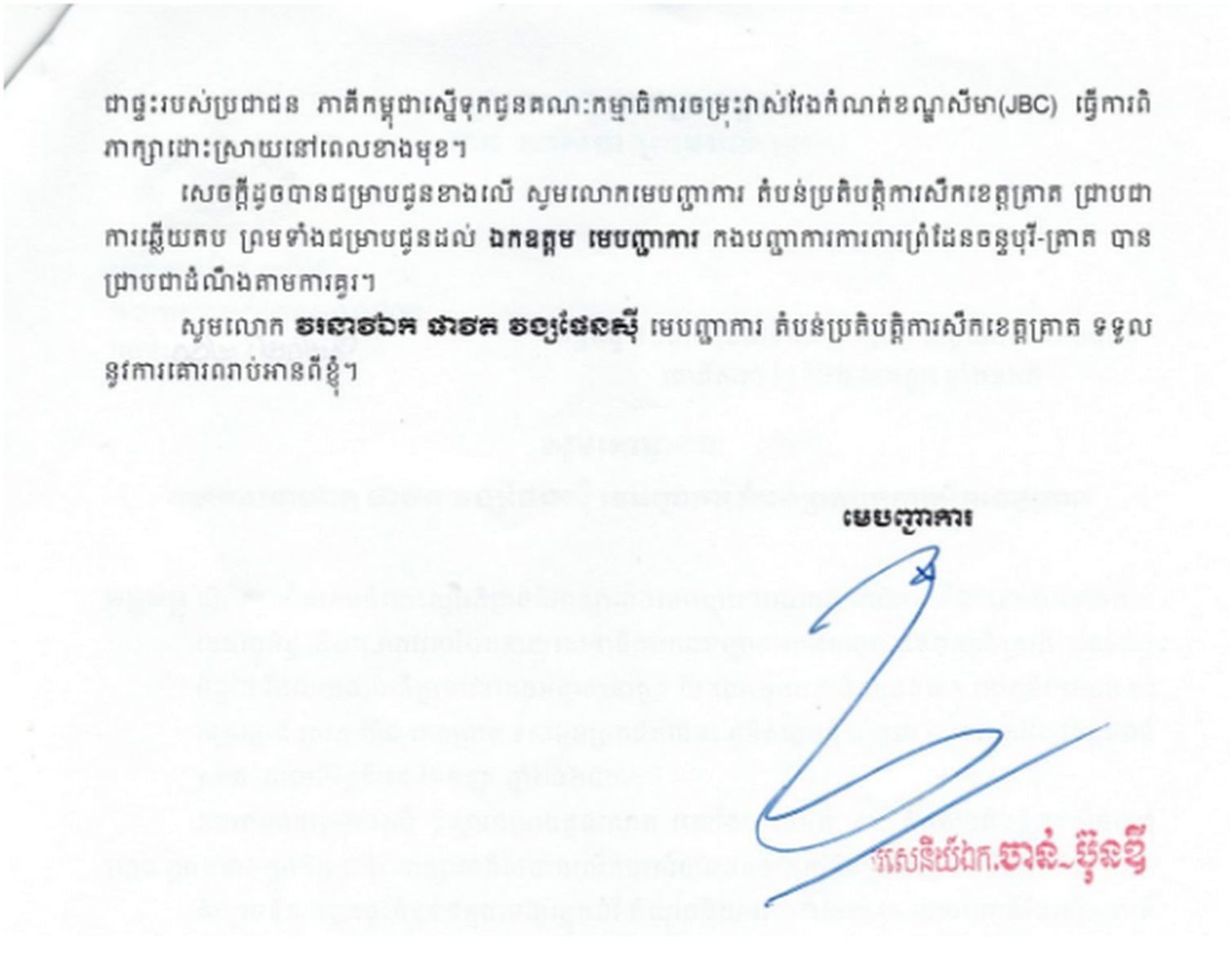 หนังสือทางการกัมพูชา ระบุว่า ปัญหาที่ฝ่ายไทยเสนอล้วนเป็นปัญหาเก่าที่ยังคั่งค้าง และเนื่องจากรัฐบาลทั้งสองประเทศได้จัดตั้งคณะกรรมาธิการเขตแดนร่วม (JBC) ขึ้นมาแล้ว ดังนั้นปัญหาที่ยังไม่มีความชัดเจนจึงสมควรให้เป็นหน้าที่ของ JBC เป็นผู้แก้ไขตามกฎหมายของทั้งสองประเทศ ทั้งนี้ เอกสารยังได้ย้ำถึงความสัมพันธ์อันดีระหว่างหน่วยงานในพื้นที่ ที่มีการติดต่อประสานงานกันอย่างใกล้ชิดและร่วมมือแก้ไขปัญหาโดยยึดหลักสันติวิธีมาโดยตลอด โดยหนังสือฉบับนี้ได้ถูกส่งต่อเพื่อให้ผู้บัญชาการป้องกันชายแดนจันทบุรีและตราดได้รับทราบต่อไป