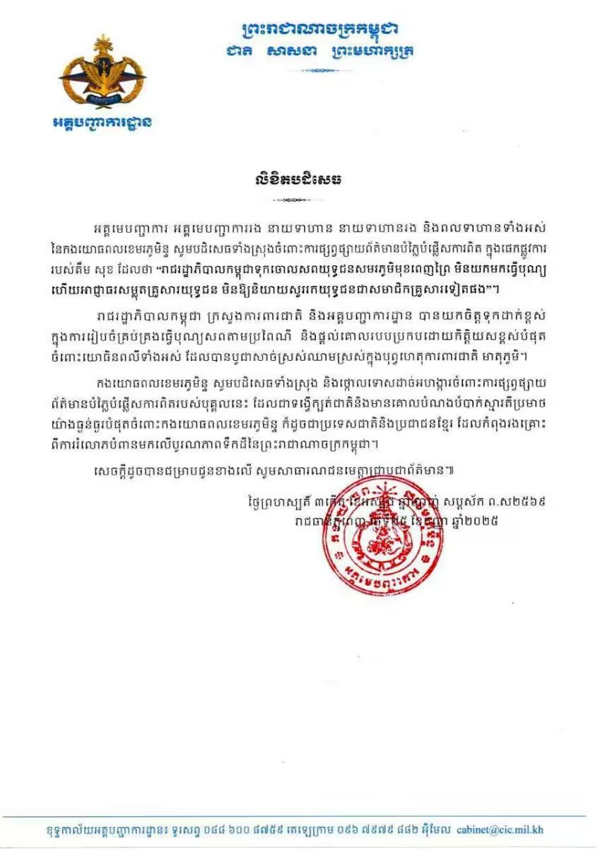 กองทัพกัมพูชาขอปฏิเสธโดยสิ้นเชิงและประณามอย่างรุนแรงต่อการเผยแพร่ข้อมูลที่บิดเบือนของบุคคลนี้ ซึ่งเป็นการทรยศชาติและมุ่งหมายดูหมิ่นกองทัพกัมพูชาอย่างร้ายแรง รวมถึงชาติและประชาชนกัมพูชาที่กำลังถูกละเมิดบูรณภาพแห่งดินแดนแห่งราชอาณาจักรกัมพูชา”
