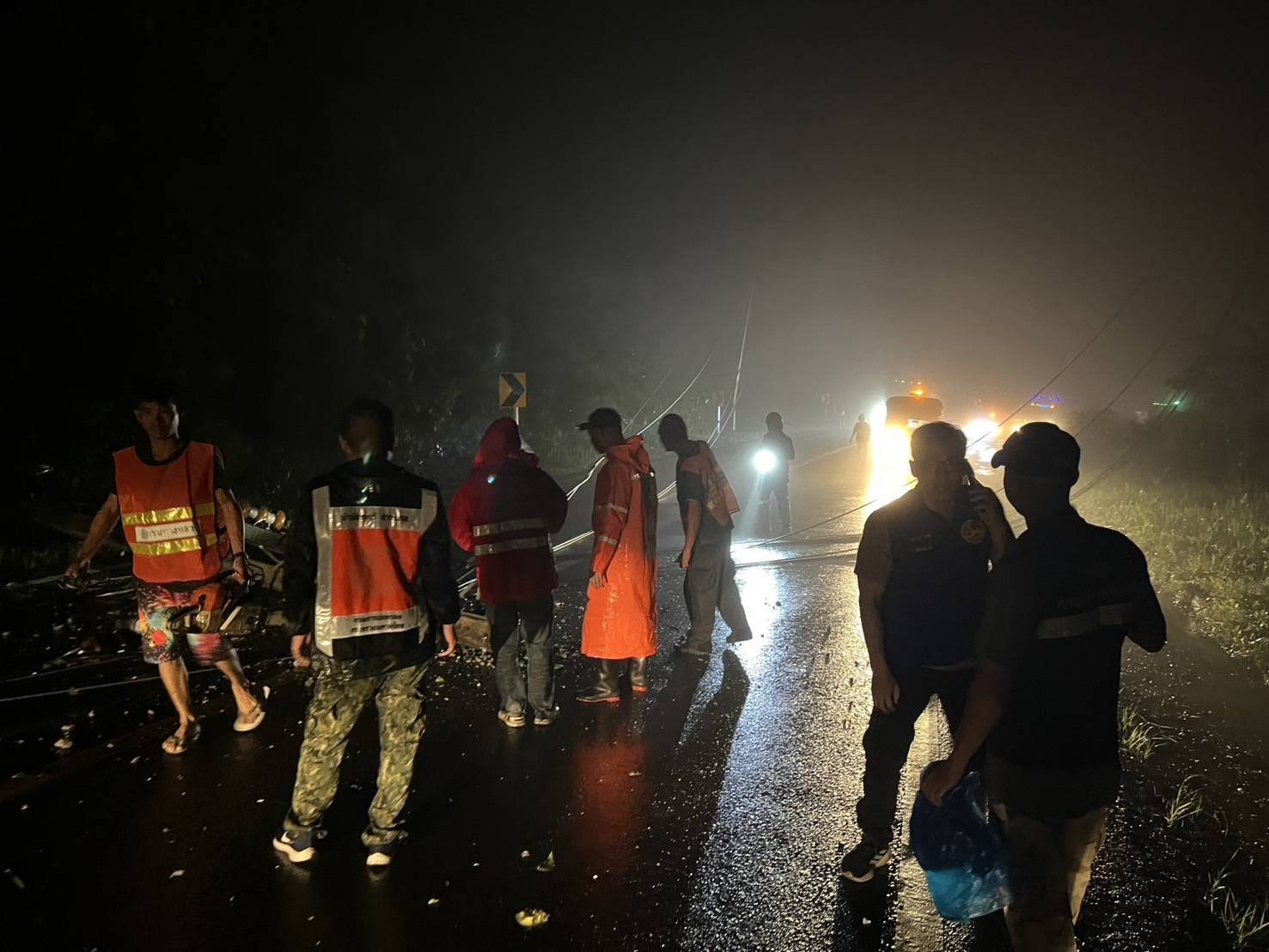 เสาไฟฟ้าล้ม ขวางถนนทางหลวงหมายเลข 108 ใกล้สามแยกป่าแป๋ อ.แม่สะเรียง จ.แม่ฮ่องสอน จนท.เข้าพื้นที่เร่งเคลียร์เส้นทาง