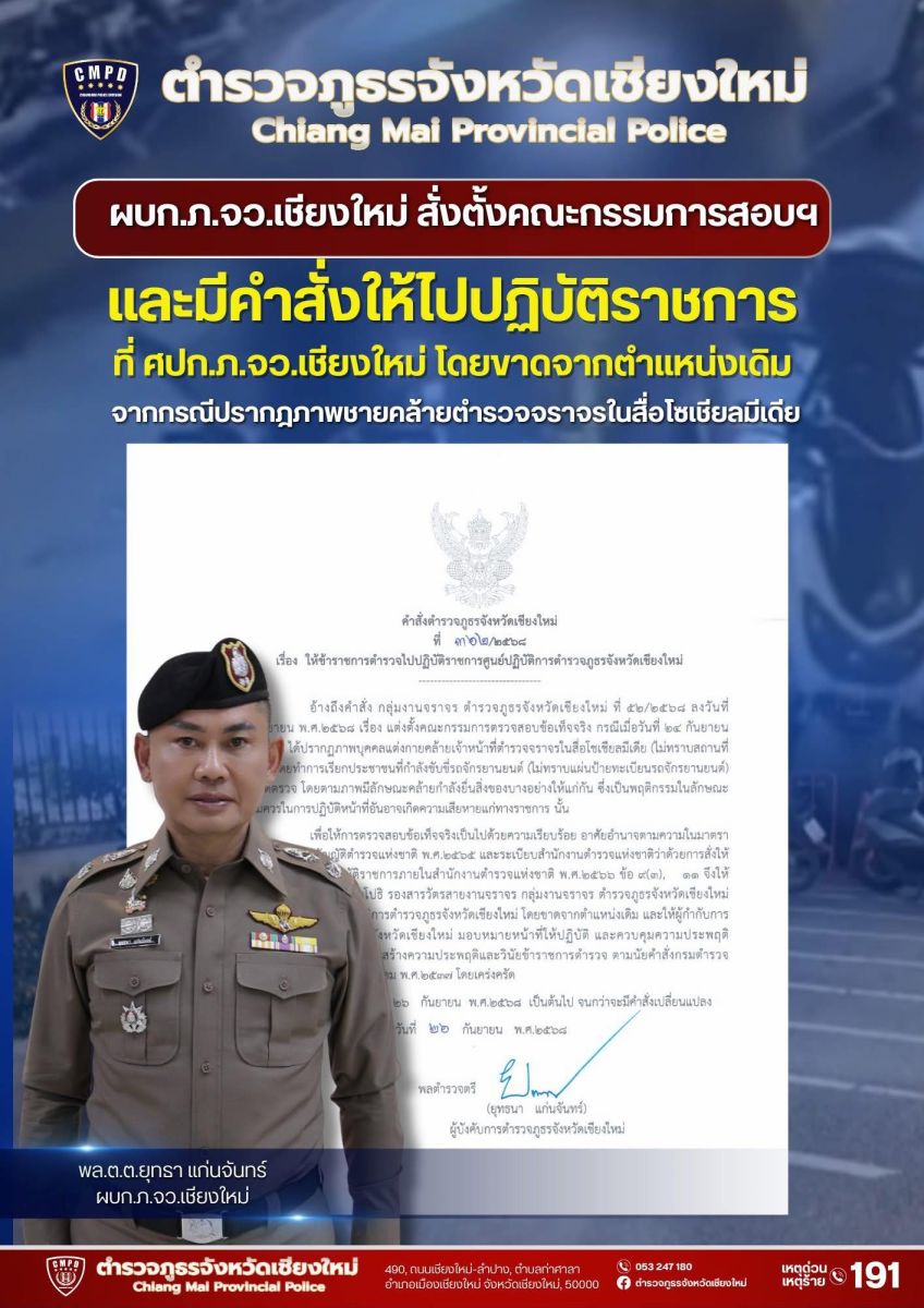 “อ้างถึงคำสั่ง กลุ่มงานจราจร ตำรวจภูธรจังหวัดเชียงใหม่ ที่๕/๒๕๖๘ ลงวันที่ขายน พ.ศ.๒๕๖๘ เรื่อง แต่งตั้งคณะกรรมการตรวจสอบข้อเท็จจริง กรณีเมื่อวันที่๒๔ กันยายนได้ปรากฏภาพบุคคลแต่งกายคล้ายเจ้าหน้าที่ตำรวจจราจรในสื่อโซเชียลมีเดีย (ไม่ทราบสถานที่โดยทำการเรียกประชาชนที่กำลังขับขี่รถจักรยานยนต์ (ไม่ทราบแผ่นป้ายทะเบียนรถจักรยานยนต์)ตตรวจ โดยตามภาพมีลักษณะคล้ายกำลังยื่นสิ่งของบางอย่างให้แก่กัน ซึ่งเป็นพฤติกรรมในลักษณะมควรในการปฏิบัติหน้าที่อันอาจเกิดความเสียหายแก่ทางราชการ นั้น