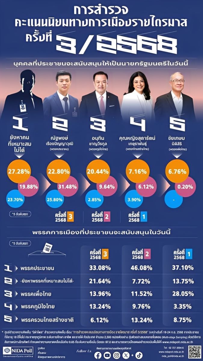 วันที่ 28 กันยายน 2568 ศูนย์สำรวจความคิดเห็น “นิด้าโพล” สถาบันบัณฑิตพัฒนบริหารศาสตร์ (นิด้า) สำรวจความคิดเห็นเรื่อง “การสำรวจคะแนนนิยมทางการเมืองรายไตรมาส ครั้งที่ 3/2568” ระหว่างวันที่ 19-24 ก.ย. 2568 จากประชาชนที่มีอายุ 18 ปีขึ้นไป กระจายทุกภูมิภาค ระดับการศึกษา อาชีพ และรายได้ ทั่วประเทศ จำนวน 2,500 หน่วยตัวอย่าง เกี่ยวกับคะแนนนิยมทางการเมือง