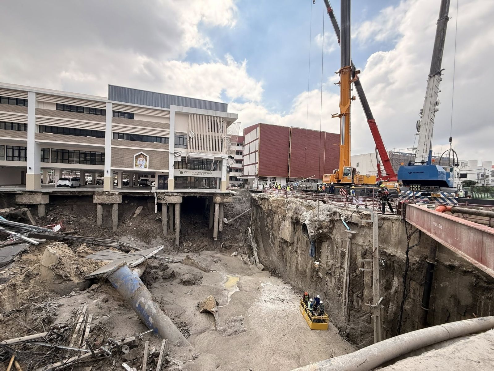 อย่างไรก็ตาม ในช่วงที่ผ่านมาจะมีฝนตกเล็กน้อย แต่ไม่มีผลกระทบต่อแผนงานในภาพรวม ทั้งนี้ ได้มีการจัดเตรียมเครื่องสูบน้ำ และวางกระสอบทรายกั้น ในกรณีที่มีฝนตกหนักอย่างต่อเนื่อง สำหรับการยกวัสดุสิ่งของ เช่น เสาไฟฟ้า หม้อแปลงไฟฟ้า ท่อน้ำประปา และ เศษวัสดุอื่นๆ ที่อยู่ภายในหลุม ได้ทยอยนำขึ้นมาบางส่วนก่อน ซึ่งต้องดำเนินการด้วยความระมัดระวัง และต้องคำนึงถึงความปลอดภัยของเจ้าหน้าที่ผู้ปฏิบัติงานทุกคน ในส่วนของประชาชนที่ได้รับผลกระทบด้านที่อยู่อาศัย ทางผู้รับจ้างงานโยธารายงานว่า สามารถติดต่อผู้ได้ผลกระทบแล้วและได้จัดหาที่พักให้ระหว่างการซ่อมแซมต่อไป
