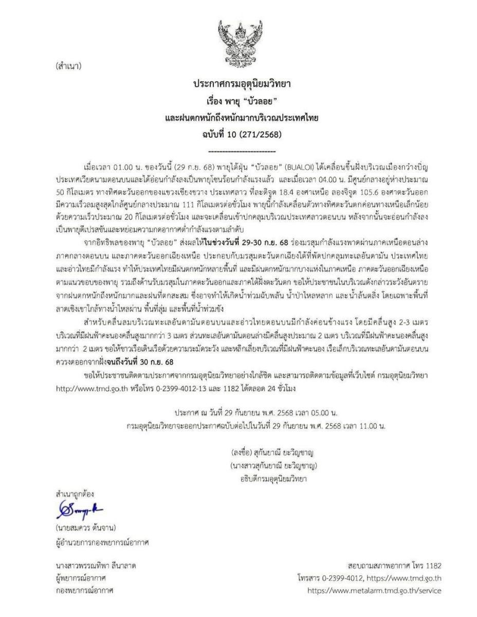 อัปเดตเส้นทางพายุ “บัวลอย” เช้า 29 ก.ย. 68