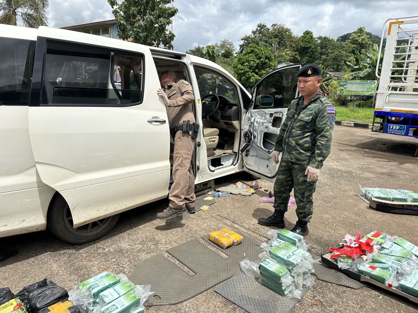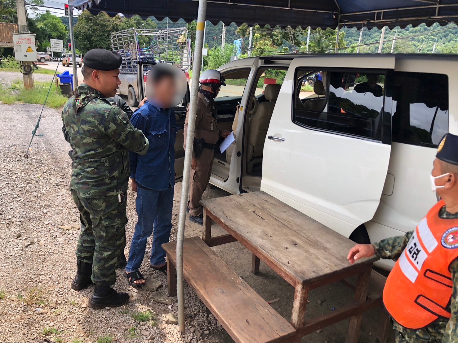 โดยในเวลา 12.00 น. เจ้าหน้าที่ฝ่ายความมั่นคง ประจำจุดตรวจร่วมสามแยกทองผาภูมิ พบรถยนต์ตู้ สีขาว หมายเลขทะเบียน จ.กาญจนบุรี ลักษณะตรงตามที่ได้รับแจ้งจากแหล่งข่าว ขับมาจาก อ.สังขละบุรี มุ่งหน้า อ.เมืองกาญจนบุรี จึงให้สัญญาณหยุดรถเพื่อตรวจสอบ พบชาย อายุ 51 ปี เป็นผู้ขับขี่ ซึ่งขณะที่เจ้าหน้าที่พูดคุยสอบถามแสดงอาการพิรุธ จึงทำการตรวจค้นภายในรถยนต์คันดังกล่าวพบว่าสภาพรถถูกดัดแปลงและซุกซ่อนยาเสพติดไว้ภายในจำนวนมาก โดยตรวจยึดของกลาง 5 รายการ
