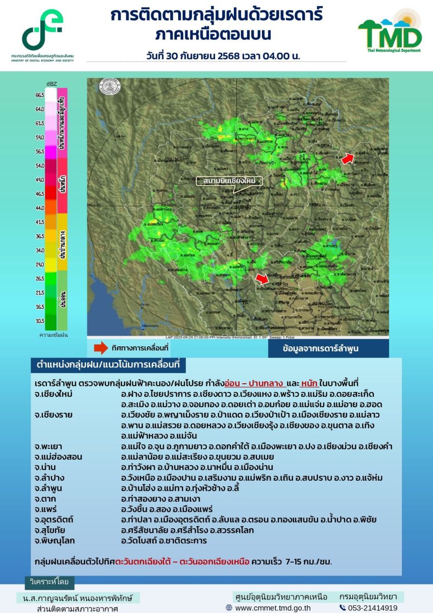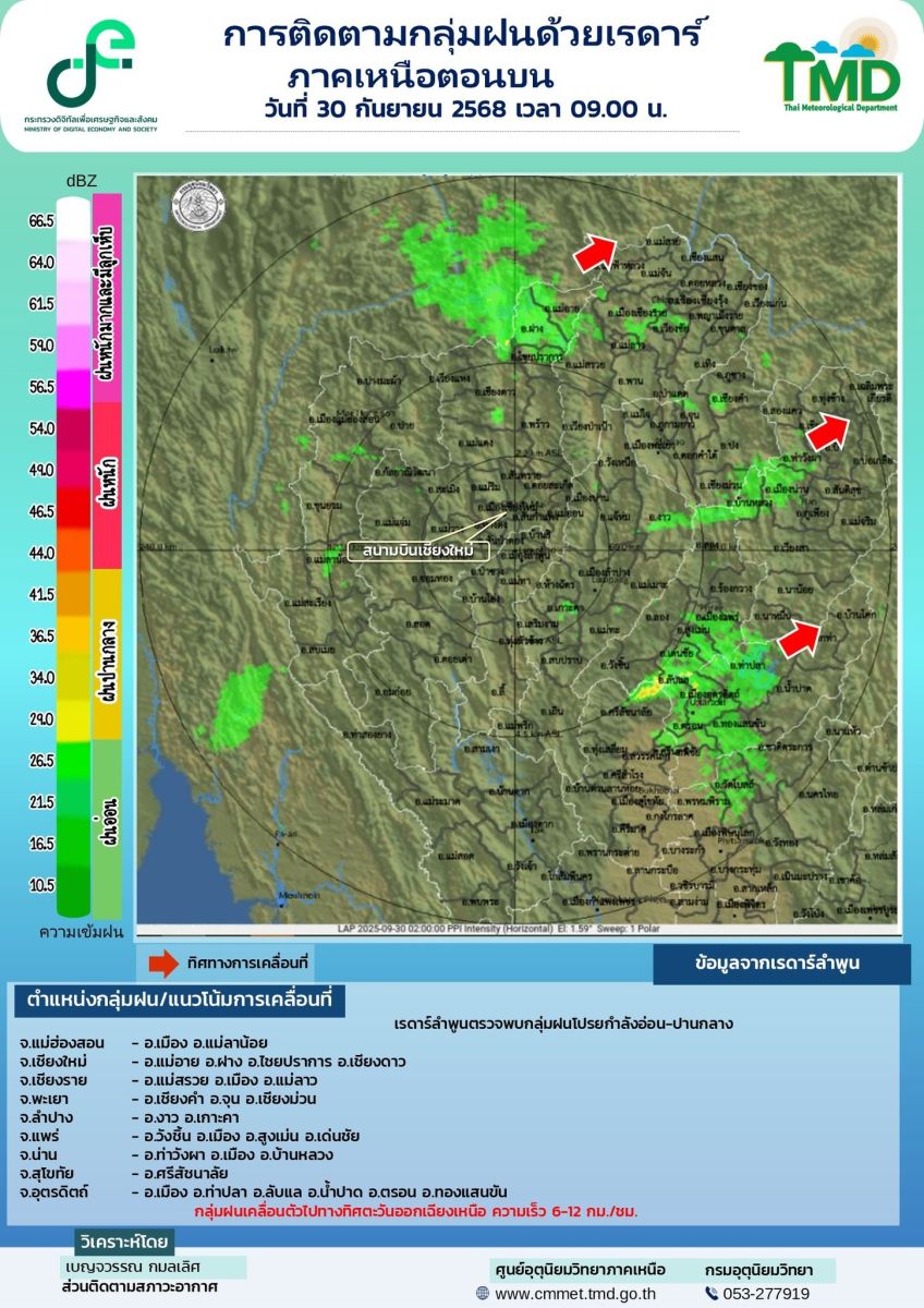 โดยศูนย์อุตุนิยมวิทยาภาคเหนือ ได้ออกประกาศเรื่องฝนตกหนักถึงหนักมากบริเวณภาคเหนือและแจ้งข้อมูลการเคลื่อนที่ของกลุ่มฝนด้วยเรดาร์ตรวจอากาศไว้ล่วงหน้าแล้ว