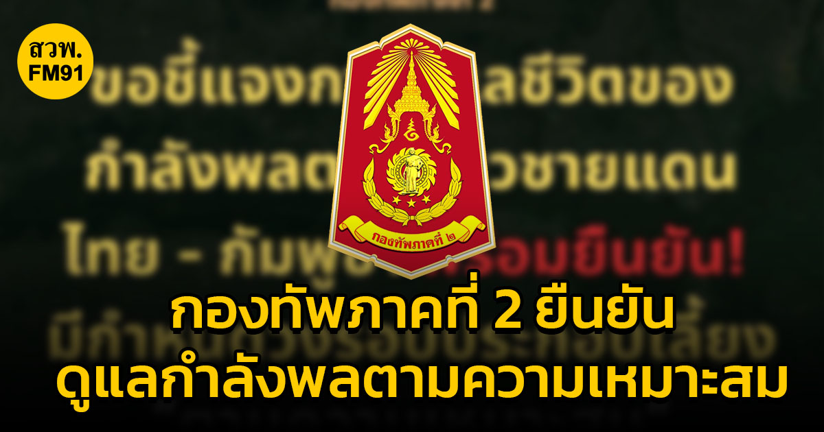 กองทัพภาคที่ 2 ขอยืนยันว่า กำลังพลทุกนายได้รับการดูแลด้านเสบียงอาหารและน้ำดื่มอย่างเพียงพอ มีความพร้อมในการปฏิบัติหน้าที่ปกป้องอธิปไตยของชาติ และขอให้พี่น้องประชาชนมั่นใจว่า ทหารไทยทุกนายได้รับการดูแลอย่างดี และเหมาะสมตามสิทธิ์ที่ควรได้รับ