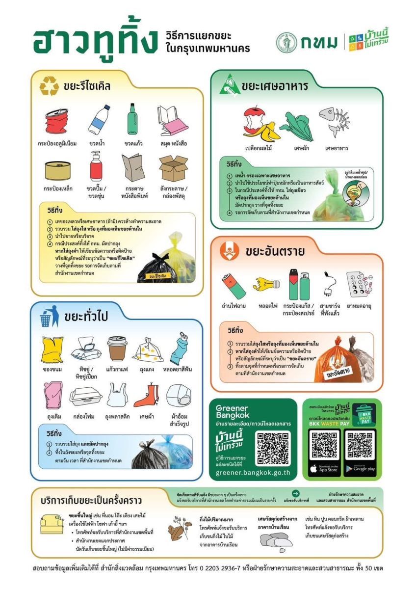 สอบถามข้อมูลเพิ่มเติมได้ที่ สำนักสิ่งแวดล้อม กทม. หรือดูวิธีการแยกขยะได้ที่เว็บไซต์ https://greener.bangkok.go.th/welcome/