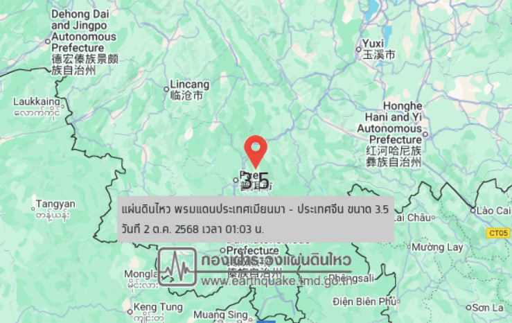 วันที่ 2 ต.ค. 2568 เวลา 01.03 น. กองเฝ้าระวังแผ่นดินไหว กรมอุตุนิยมวิทยา แจ้งเหตุ แผ่นดินไหว ขนาด 3.5 ลึก 10 กม. บริเวณพรมแดนประเทศเมียนมา - ประเทศจีน(22.95°N,101.22°E)