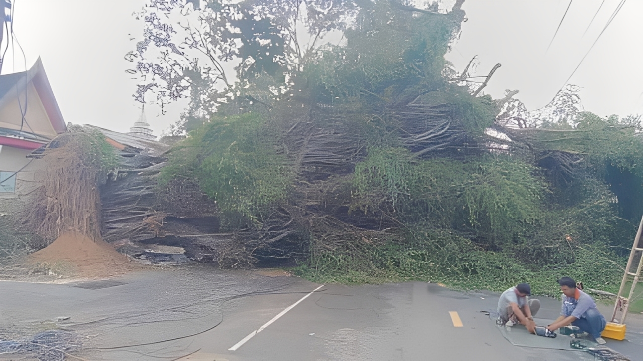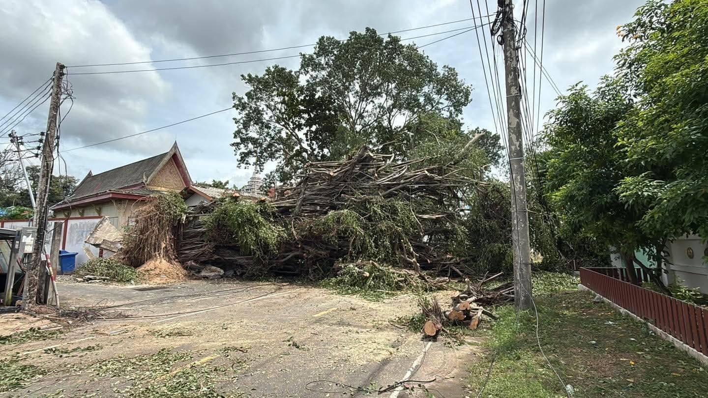 แต่เมื่อตื่นขึ้นไปสำรวจ พบว่าเป็นต้นไทรขนาดใหญ่ที่มีอายุไม่ต่ำกว่า 100 ปี ที่ขึ้นอยู่ริมกำแพงทางด้านหลังวัด โค่นล้มลงกรีดขวางทางจราจรถนนเขื่อนธานี จนไม่สามารถสัญจรได้ แต่โชคดีที่ไม่มีใครได้รับบาดเจ็บ มีเพียงสายไฟฟ้าและสารสื่อสารได้รับความเสียหาย