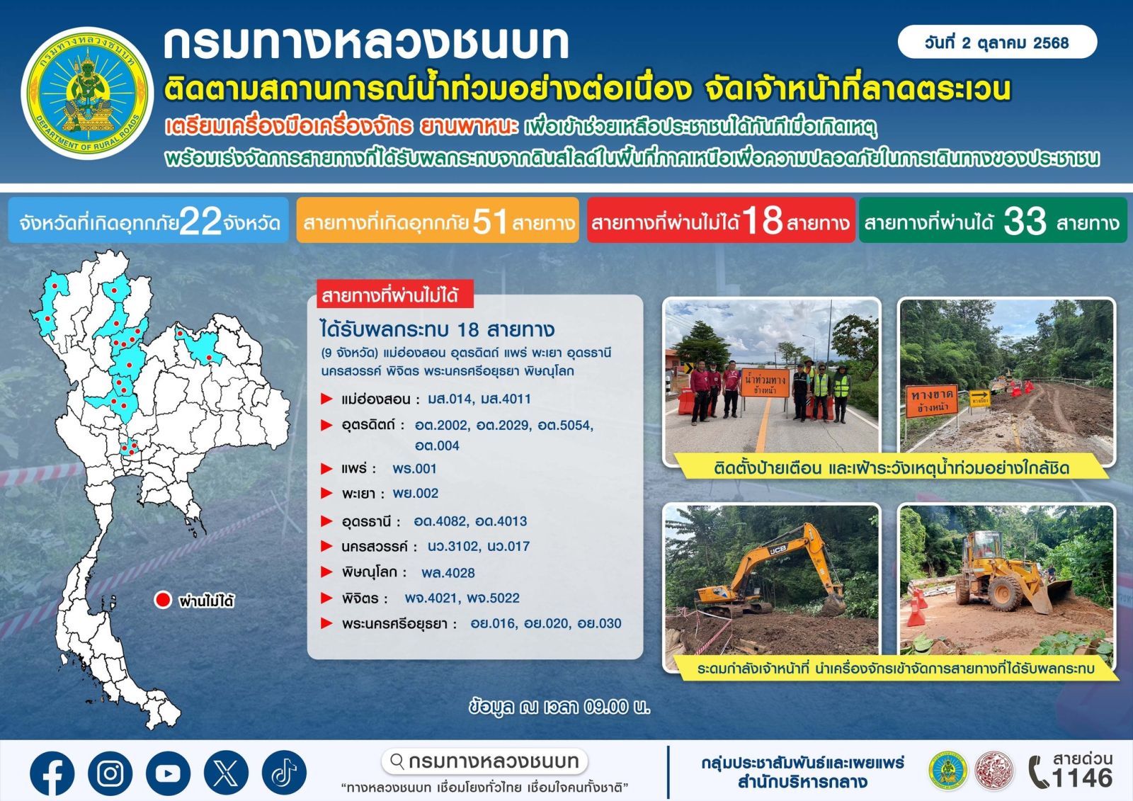 รักษาราชการแทนอธิบดีกรมทางหลวงชนบท กล่าวเพิ่มเติมว่า ปัจจุบันสถานการณ์อุทกภัยของ ทช. สำนักบำรุงทาง รายงานว่าขณะนี้ (2 ต.ค. 68) มีโครงข่ายในความรับผิดชอบของ ทช. ประสบอุทกภัยใน 22 จังหวัด รวม 51 สายทาง (อุตรดิตถ์, เพชรบูรณ์, แพร่, พะเยา, แม่ฮ่องสอน, เชียงใหม่, กาฬสินธุ์, มหาสารคาม, เลย, อุดรธานี, อุบลราชธานี, จันทบุรี, ชลบุรี, ปราจีนบุรี, นครสวรรค์, พิจิตร, พิษณุโลก, ราชบุรี, ลพบุรี, สมุทรปราการ, สุโขทัย, พระนครศรีอยุธยา) แบ่งเป็นสามารถสัญจรผ่านได้ 33 สายทาง ไม่สามารถสัญจรผ่านได้ 18 สายทาง