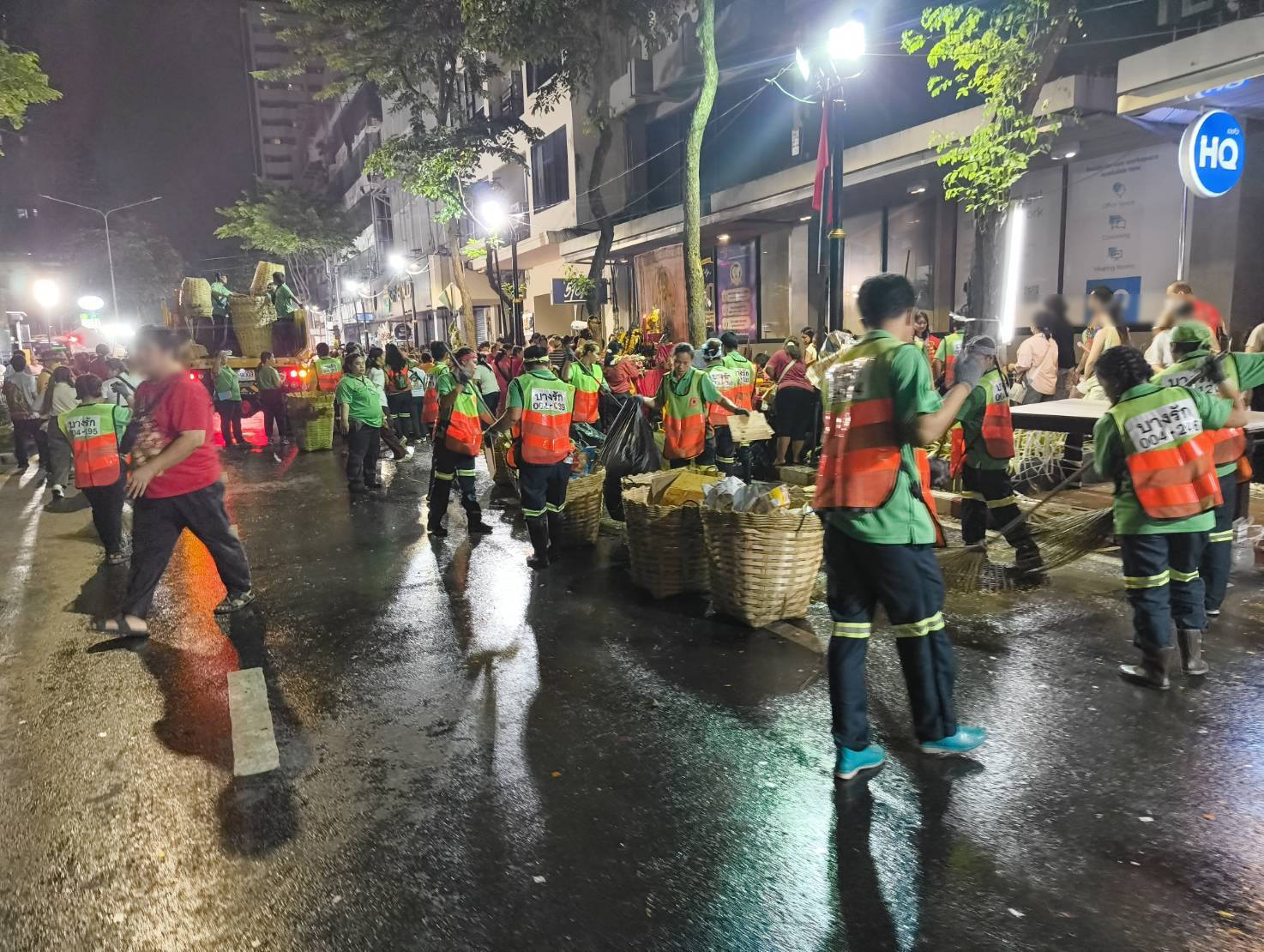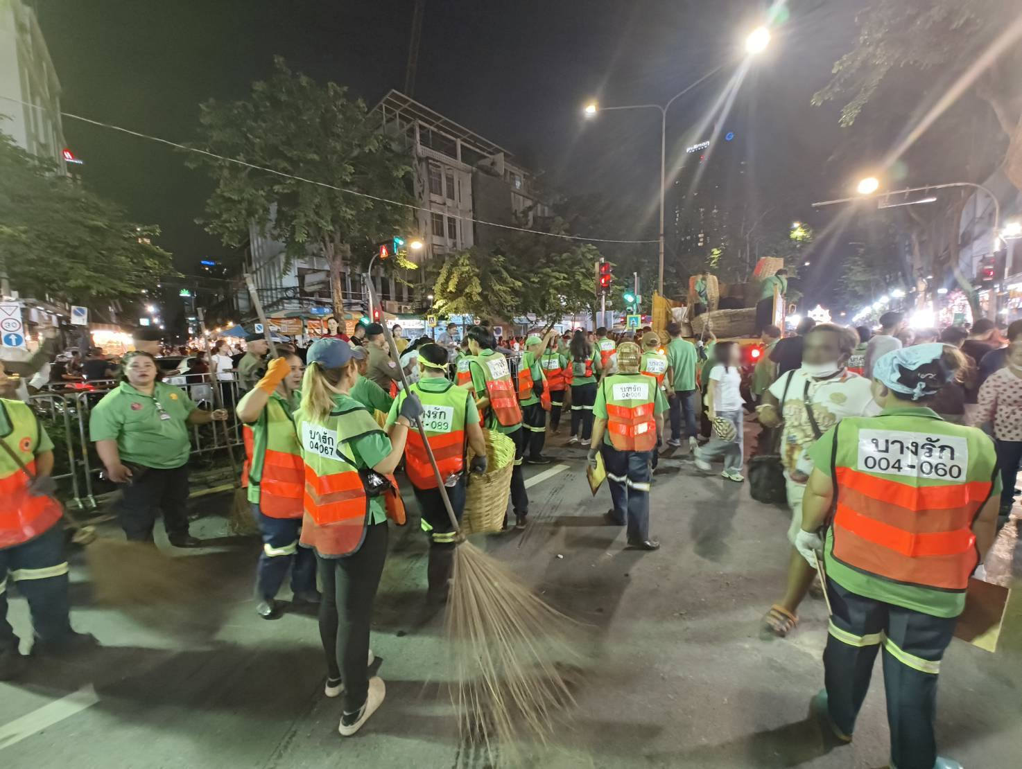 ในการนี้ผู้อำนวยการเขตบางรัก พร้อมด้วยประธานสภากรุงเทพมหานคร และคณะผู้บริหารเขต ลงพื้นที่ดูแลความเรียบร้อย พร้อมให้กำลังใจเจ้าหน้าที่ฝ่ายรักษาความสะอาดฯ ที่เข้าประจำจุดลุยเก็บขยะและทำความสะอาดพื้นที่กันอย่างแข็งขัน ซึ่งนอกจากขยะพลาสติก เศษอาหารหรือเครื่องดื่มแล้ว ระหว่างทางยังมีลูกมะพร้าวที่สานุศิษย์และผู้ร่วมงานเตรียมมาเพื่อชำระล้างพื้นถนนให้สะอาด ซึ่งอีกนัยหนึ่งของการ 'ทุบมะพร้าว' นั่นเพื่อแสดงถึงการละทิ้ง 'อัตตา' ของตัวเอง โดยมีเจ้าหน้าที่เทศกิจที่คอยอำนวยความสะดวกให้กับประชาชนที่สัญจรผ่านไปมาทั่วทั้งงานและตลอดเส้นทางแห่