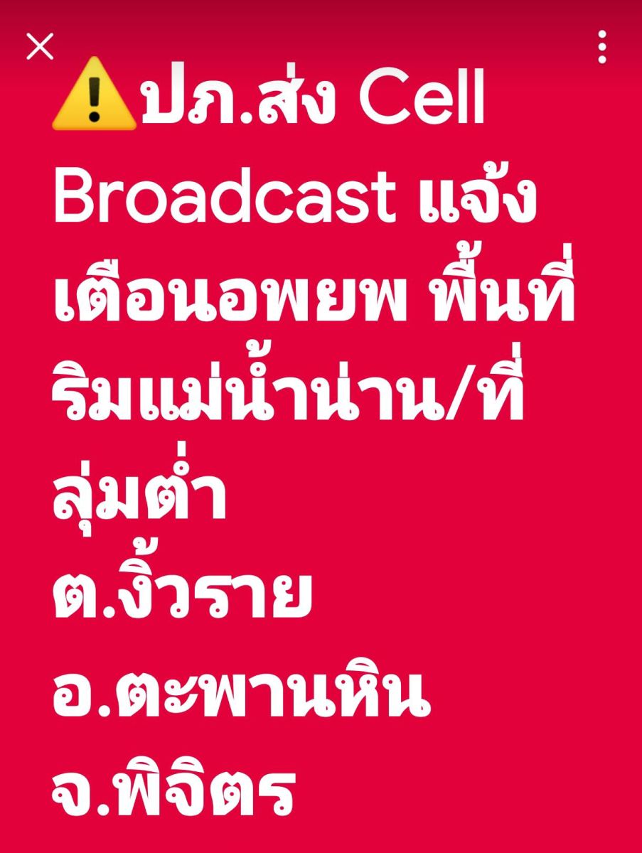 ปภ. จึงได้ร่วมกับผู้ให้บริการเครือข่ายโทรศัพท์เคลื่อนที่ AIS True และ NT ส่งข้อความแจ้งเตือนผ่าน Cell Broadcast แจ้งเตือนอพยพ อ.ตะพานหิน จ.พิจิตร
