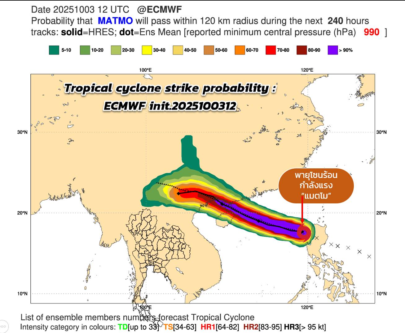 กรมอุตุนิยมวิทยา อัปเดตเส้นทางพายุโซนร้อนกำลังแรง "แมตโม (MATMO)" ได้เคลื่อนลงสู่ทะเลจีนใต้ตอนบนแล้ว กำลังเคลื่อนตัวไปทางเกาะไหลหลำ และคาดว่าจะขึ้นฝั่งที่ประเทศจีนตอนใต้หรือแนวประเทศเวียดนามตอนบน ช่วงวันที่ 5-6 ต.ค.68 มีแนวโน้มจะแรงขึ้นเป็นพายุไต้ฝุ่นได้ พายุนี้จะไม่เคลื่อนเข้าสู่ประเทศไทย ไม่น่ากังวล แต่เมื่ออ่อนกำลังลงเป็นหย่อมความกดอากาศต่ำแล้วจะทำให้ภาคเหนือ ภาคอีสานตอนบน มีเมฆและฝนเพิ่มขึ้นบ้าง ส่วนใหญ่ยังเป็นฝนเล็กน้อยถึงปานกลาง