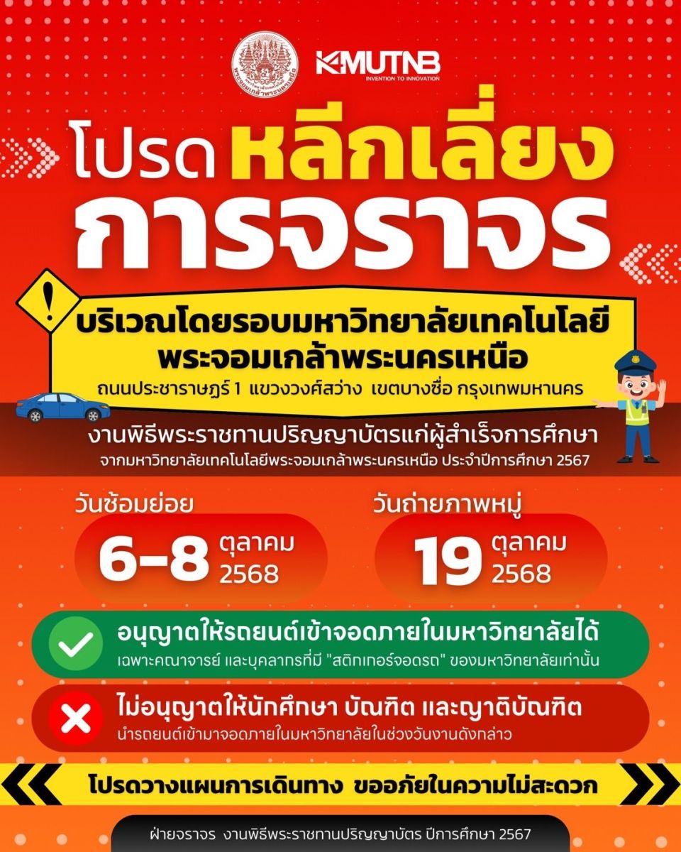 โปรดหลีกเลี่ยงเส้นทางการจราจรผ่านหน้ามหาวิทยาลัยเทคโนโลยีพระจอมเกล้าพระนครเหนือ (มจพ.) ถนนพิบูลสงคราม