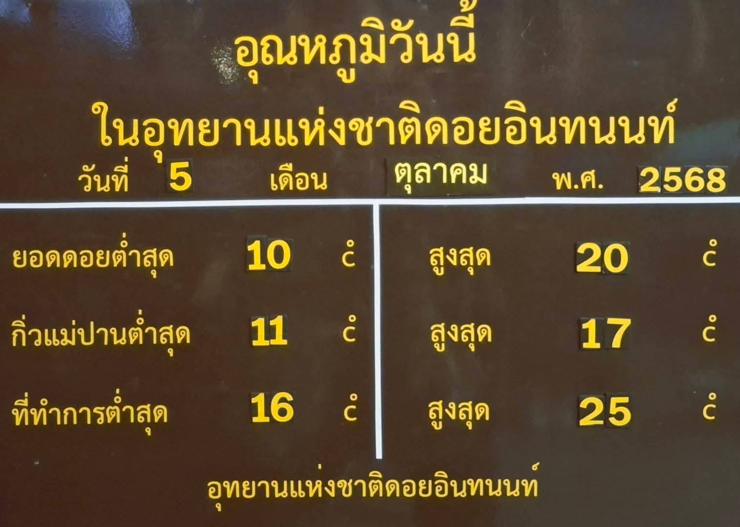 จากการตรวจวัดเมื่อเวลา 07:00 น. พบว่ายอดดอยมีอุณหภูมิต่ำสุด 10 องศาเซลเซียส ขณะที่บริเวณกิ่วแม่ปาน บันทึกอุณหภูมิได้ที่ 11 องศาเซลเซียส และที่ทำการมีอุณหภูมิ 16 องศาเซลเซียส