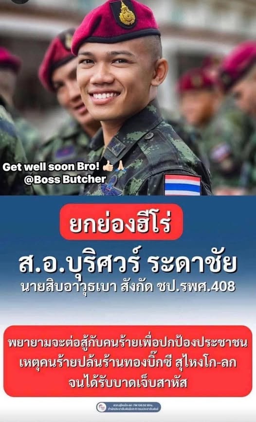 ชายผู้นั้นคือ ส.อ.บุริศวร์ ระดาชัย นายสิบอาวุธเบา สังกัด ชป.รพศ.408 ซึ่งในขณะเกิดเหตุได้เข้ามาใช้บริการในห้างฯ และเมื่อเห็นสถานการณ์ที่ไม่ชอบมาพากล ส.อ.บุริศวร์ ไม่ลังเลที่จะวิ่งไปที่รถเพื่อหยิบอาวุธประจำกายออกมาหวังจะระงับเหตุร้าย แต่ถูกคนร้ายยิงจนล้มลง ทำให้ได้รับบาดเจ็บหลายจุด