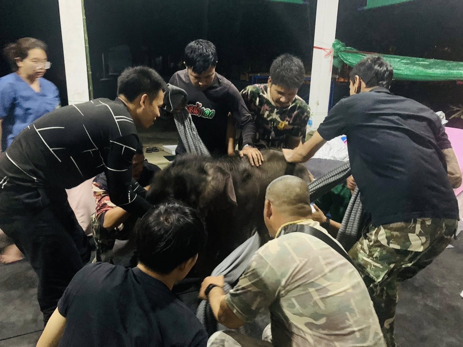 3. ลูกช้างป่ามีกำลังในการถีบตัวเองเพื่อให้ตัวเองยืนขึ้นบ่อยครั้ง โดยมีสัตวแพทย์และคณะเจ้าหน้าที่ช่วยพยุงตัว จับเท้ายืดเหยียด และนวดกระตุ้นกล้ามเนื้อขณะเดิน รวมทั้งมีการใช้เครื่องอัลตราซาวน์บำบัด
