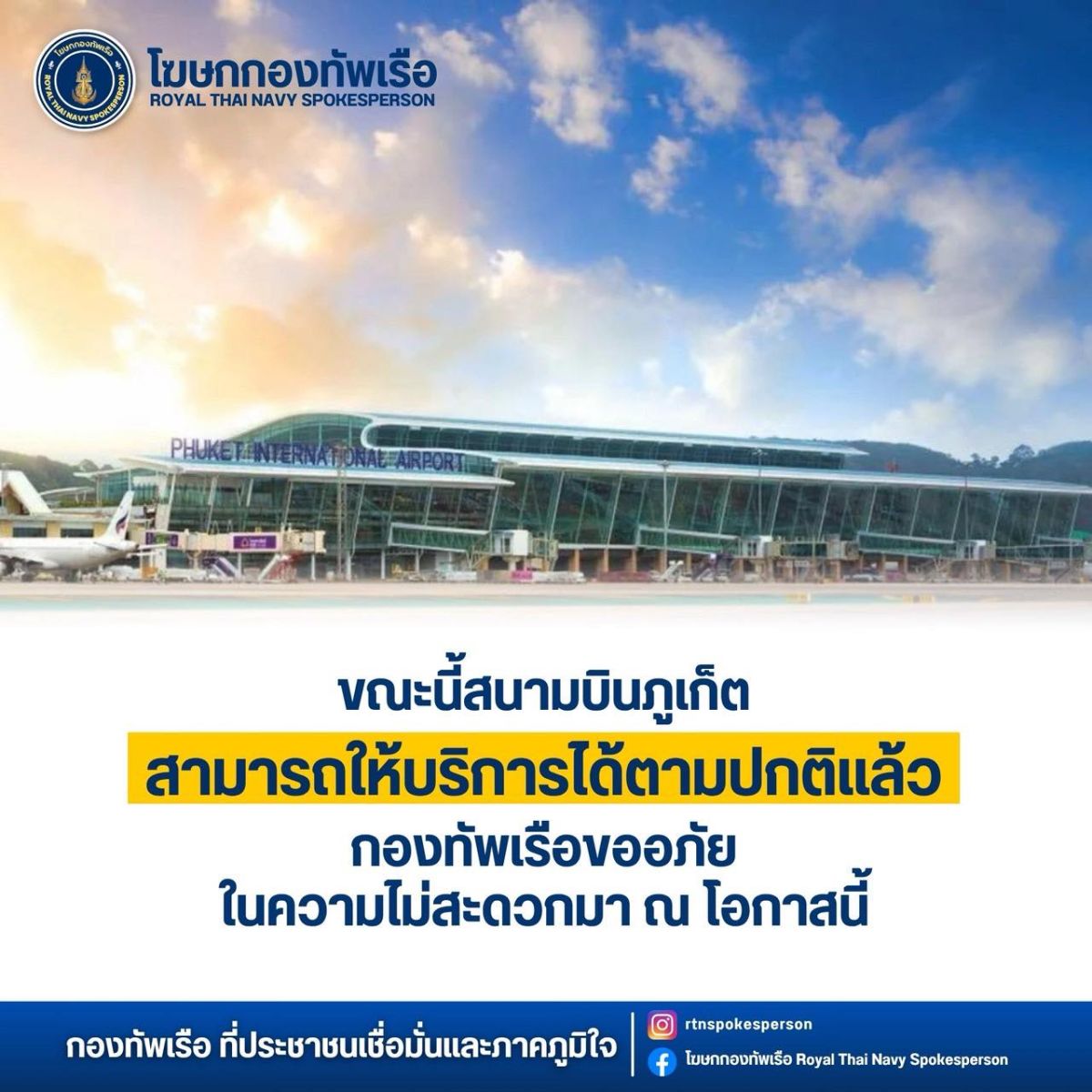 เวลา 16.56 น. กองทัพเรือ Royal Thai Navy รายงาน อัปเดต สนามบินภูเก็ต สามารถให้บริการได้ตามปกติแล้ว กองทัพเรือ ขออภัยในความไม่สะดวกมา ณ โอกาสนี้