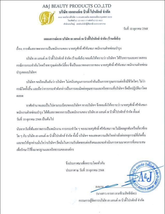 คืบหน้า ล่าสุด บริษัท เอ แอนด์ เจ บิวตี้โปรดักส์ (ร้านเจ้เล้ง) ได้ออกแถลงการณ์ ขอแจ้งให้ทราบถึงการดำเนินการต่อกรณีการทารุณสัตว์ที่เกี่ยวข้องกับพนักงานของบริษัทว่า บริษัท ไม่สนับสนุนและรับไม่ได้กับการทารุณกรรมต่อสิ่งมีชีวิตใดๆ ทุกกรณี จึงเรียนแจ้งว่า พนักงานฝ่ายซ่อมบำรุง พ้นสภาพจากการเป็นพนักงานบริษัทฯ ตั้งแต่วันที่ 10 ต.ค.2568 เป็นต้นไป นับจากนี้ โดยการกระทำใดๆ ของบุคคลดังกล่าว จะไม่มีผลผูกพันหรือเกี่ยวข้องกับบริษัทฯ จึงประกาศมาเพื่อทราบโดยทั่วกัน